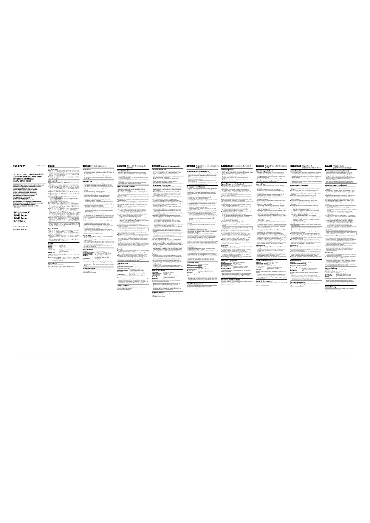 Foydalanish bo‘yicha ko‘rsatmalar/ Инструкции за експлоатация/Kasutusjuhend/ Eksploatacijos instrukcijos/Lietošanas instrukcijas/ Navodila za uporabo/Bruksanvisning/ Upute za rad/ / / / 4-695-344-A1 (1) Dispositif de stockage de données Avant utilisation Ce produit peut uniquement être utilisé avec des dispositifs prenant en charge les SSD SATA 2,5 pouces et il est possible qu’une mise à jour du logiciel soit nécessaire, en fonction du dispositif que vous utilisez. Pour les détails, consultez le site du support technique de votre dispositif avant utilisation. Veuillez noter que le fonctionnement n’est pas garanti pour tous les produits.Pour obtenir des informations sur les produits compatibles, consultez le site du support technique ci-dessous. Remarques sur l’emploi N’essayez pas de démonter ou de modifier ce produit, car cela pourrait entraîner un incendie, une électrocution ou endommager votre produit.Si ce produit dégage de la fumée ou une odeur inhabituelle, si vous renversez un liquide ou laissez tomber un corps étranger dans le produit, mettez immédiatement le produit hors tension et cessez de l’utiliser.Ce support est destiné à un produit électronique. Ne l’exposez pas à l’électricité statique.Ne heurtez pas ce produit et évitez de le plier, de le laisser tomber ou de le mouiller.Ne touchez pas directement les bornes de ce produit et ne laissez aucun corps étranger pénétrer à l’intérieur de celui-ci.Le formatage de ce produit supprime toutes les données qu’il contient.Les données enregistrées risquent d’être endommagées ou perdues dans les cas suivants :Si vous retirez ce produit ou si vous coupez l’alimentation pendant le formatage, la lecture ou l’écriture de données.Si vous utilisez ce produit dans des endroits soumis à de l’électricité statique ou à des parasites électriques.N’utilisez pas et ne rangez pas ce produit aux endroits suivants. Sinon, ce produit ne fonctionnera pas correctement.Endroit extrêmement chaud, froid ou humide. Ne laissez jamais ce produit exposé à une température élevée, comme en plein soleil, près d’un appareil de chauffage ou à l’intérieur d’une voiture, toutes fenêtres closes. Sinon, il risque de ne plus fonctionner ou de se déformer.Les endroits humides ou corrosifs. Vérifiez le sens d’insertion correct avant utilisation. Nous vous conseillons de réaliser une copie de sauvegarde de vos données importantes. Sony Corporation n’assume aucune responsabilité si vos données enregistrées sont endommagées ou perdues.Pour formater ce produit, utilisez un produit compatible qui possède une fonction de formatage.Les données de ce produit ne sont pas complètement effacées par l’opération de formatage ou de suppression. Avant de donner ou de disposer ce produit, supprimez les données qui relèvent de votre responsabilité en utilisant une application de suppression de données disponible à la vente ou détruisez physiquement ce produit.Si le produit est utilisé pendant un long moment ou si vous y accédez un grand nombre de fois, son coffret peut devenir chaud, mais ceci est normal. Si cela se produit, veuillez ne pas le toucher pendant un long moment afin d’éviter une brûlure à basse température. Entretien N’utilisez pas d’alcool, diluant, benzine, etc. Ces produits peuvent dégrader ou endommager la surface.Le nettoyage de cet appareil avec un tissu de nettoyage chimique peut entraîner une décoloration ou un changement de couleur.L’utilisation de solvant volatil, comme un insecticide, ou un contact prolongé de produits en caoutchouc ou vinyle avec cet appareil peut détériorer ou endommager cet appareil.N’utilisez pas de solvant liquide, etc. Le liquide peut pénétrer à l’intérieur de cet appareil et causer une panne. Spécifications InterfaceNorme SATA 6GbpsTempérature de fonctionnement0 °C à 70 °C (32 °F à 158 °F) Température de stockage-40 °C à +85 °C (-40 °F à +185 °F)Dimensions (environ) (L H P)100 mm 9,5 mm 69,85 mm(3 15/16 po. 3/8 po. 2 3/4 po.) (parties saillantes non comprises)Poids (environ)58 g (2,05 oz)La conception et les spécifications peuvent être modifiées sans préavis.Les noms des systèmes et produits mentionnés dans ce mode d’emploi sont des marques ou des marques déposées des sociétés qui les ont développés. Les symboles