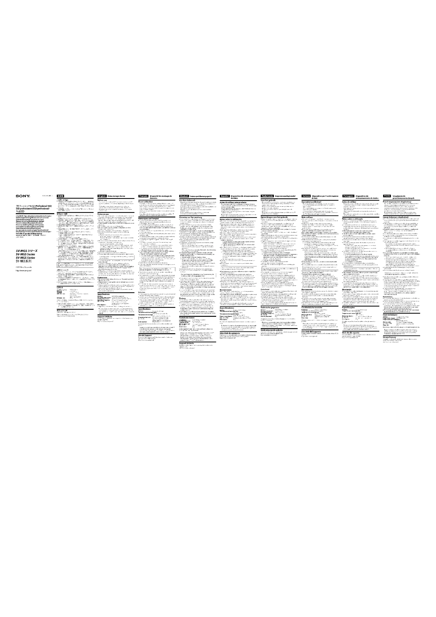 /Operating Instructions/Mode d’emploi/ Bedienungsanleitung/Manual de instrucciones/ Gebruiksaanwijzing/Istruzioni per l’uso/ Manual de instruções/Instrukcja obsługi/ Návod k obsluze/Használati útmutató/ Návod na obsluhu/Οδηγίες λειτουργίας/ Instrucţiuni de utilizare/Bruksanvisning/ Betjeningsvejledning/Käyttöohjeet/ Инструкции за експлоатация/Kasutusjuhend/ Eksploatacijos instrukcijos/Lietošanas instrukcijas/ Navodila za uporabo/Bruksanvisning/ Upute za rad/ / / / 5-000-463-A1 (1) Dispositif de stockage de données Avant utilisation Ce produit est un dispositif de stockage SSD dédié pour les produits Atomos, et il est possible qu’une mise à jour du logiciel soit nécessaire, en fonction du dispositif que vous utilisez. Pour les détails, consultez le site du support technique de votre dispositif avant utilisation. Veuillez noter que le fonctionnement n’est pas garanti pour tous les produits.Pour obtenir des informations sur les produits compatibles, consultez le site du support technique ci-dessous. Remarques sur l’emploi N’essayez pas de démonter ou de modifier ce produit, car cela pourrait entraîner un incendie, une électrocution ou endommager votre produit.Si ce produit dégage de la fumée ou une odeur inhabituelle, si vous renversez un liquide ou laissez tomber un corps étranger dans le produit, mettez immédiatement le produit hors tension et cessez de l’utiliser.Ce support est destiné à un produit électronique. Ne l’exposez pas à l’électricité statique.Ne heurtez pas ce produit et évitez de le plier, de le laisser tomber ou de le mouiller.Ne touchez pas directement les bornes de ce produit et ne laissez aucun corps étranger pénétrer à l’intérieur de celui-ci.Le formatage de ce produit supprime toutes les données qu’il contient.Les données enregistrées risquent d’être endommagées ou perdues dans les cas suivants :Si vous retirez ce produit ou si vous coupez l’alimentation pendant le formatage, la lecture ou l’écriture de données.Si vous utilisez ce produit dans des endroits soumis à de l’électricité statique ou à des parasites électriques.N’utilisez pas et ne rangez pas ce produit aux endroits suivants. Sinon, ce produit ne fonctionnera pas correctement.Endroit extrêmement chaud, froid ou humide. Ne laissez jamais ce produit exposé à une température élevée, comme en plein soleil, près d’un appareil de chauffage ou à l’intérieur d’une voiture, toutes fenêtres closes. Sinon, il risque de ne plus fonctionner ou de se déformer.Les endroits humides ou corrosifs. Vérifiez le sens d’insertion correct avant utilisation. Nous vous conseillons de réaliser une copie de sauvegarde de vos données importantes. Sony Corporation n’assume aucune responsabilité si vos données enregistrées sont endommagées ou perdues.Pour formater ce produit, utilisez un produit compatible qui possède une fonction de formatage.Les données de ce produit ne sont pas complètement effacées par l’opération de formatage ou de suppression. Avant de donner ou de disposer ce produit, supprimez les données qui relèvent de votre responsabilité en utilisant une application de suppression de données disponible à la vente ou détruisez physiquement ce produit.Si le produit est utilisé pendant un long moment ou si vous y accédez un grand nombre de fois, son coffret peut devenir chaud, mais ceci est normal. Si cela se produit, veuillez ne pas le toucher pendant un long moment afin d’éviter une brûlure à basse température. Entretien N’utilisez pas d’alcool, diluant, benzine, etc. Ces produits peuvent dégrader ou endommager la surface.Le nettoyage de cet appareil avec un tissu de nettoyage chimique peut entraîner une décoloration ou un changement de couleur.L’utilisation de solvant volatil, comme un insecticide, ou un contact prolongé de produits en caoutchouc ou vinyle avec cet appareil peut détériorer ou endommager cet appareil.N’utilisez pas de solvant liquide, etc. Le liquide peut pénétrer à l’intérieur de cet appareil et causer une panne. Spécifications InterfaceNorme SATA 6GbpsTempérature de fonctionnement0 °C à 40 °C (32 °F à 104 °F) Température de stockage-40 °C à +85 °C (-40 °F à +185 °F)Dimensions (environ) (L H P)75,5 mm 7,8 mm 80 mm(3 po. 5/16 po. 3 1/4 po.) (parties saillantes non comprises)Poids (environ)88 g (3,10 oz)La conception et les spécifications peuvent être modifiées sans préavis.Les noms des systèmes et produits mentionnés dans ce mode d’emploi sont des marques ou des marques déposées des sociétés qui les ont développés. Les symboles