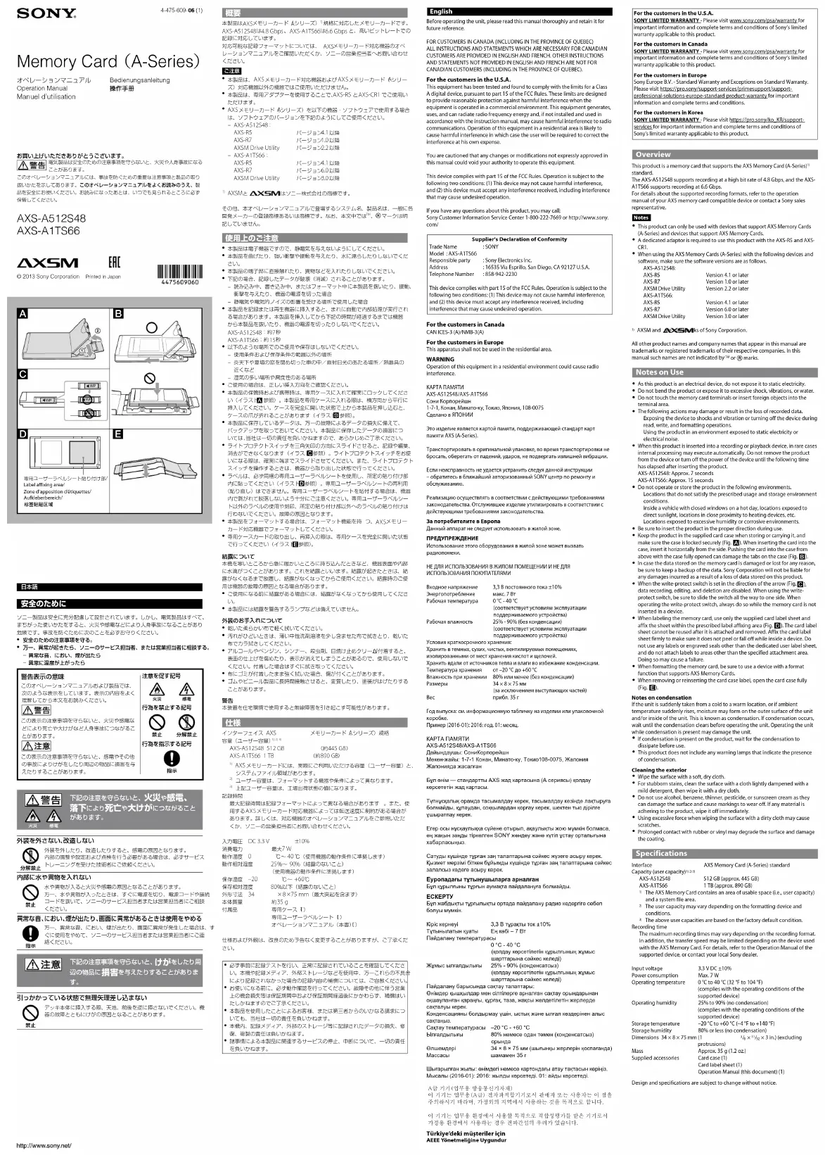 参考使用说明书中的操作条件 部件名称有害物质铅(Pb)汞 (Hg)镉 (Cd)六价铬 (Cr (VI))多溴联苯 (PBB)多溴二苯醚 (PBDE) 实装基板 × ○ ○ ○ ○ ○ 外壳 × ○ ○ ○ ○ ○ 本表格依据SJ/T 11364 的规定编制。 ○︰ 表示该有害物质在该部件所有均质材料中的含量均在 GB/T 26572规定的限量要求以下。 ×︰ 表示该有害物质至少在该部件的某一均质材料中的含量超出 GB/T 26572规定的限量要求。 W15-1 Notes Always make a test recording, and verify that it was recorded successfully. SONY WILL NOT BE LIABLE FOR DAMAGES OF ANY KIND INCLUDING, BUT NOT LIMITED TO, COMPENSATION OR REIMBURSEMENT ON ACCOUNT OF FAILURE OF THIS UNIT OR ITS RECORDING MEDIA, EXTERNAL STORAGE SYSTEMS OR ANY OTHER MEDIA OR STORAGE SYSTEMS TO RECORD CONTENT OF ANY TYPE.Always verify that the unit is operating properly before use. SONY WILL NOT BE LIABLE FOR DAMAGES OF ANY KIND INCLUDING, BUT NOT LIMITED TO, COMPENSATION OR REIMBURSEMENT ON ACCOUNT OF THE LOSS OF PRESENT OR PROSPECTIVE PROFITS DUE TO FAILURE OF THIS UNIT, EITHER DURING THE WARRANTY PERIOD OR AFTER EXPIRATION OF THE WARRANTY, OR FOR ANY OTHER REASON WHATSOEVER.SONY WILL NOT BE LIABLE FOR CLAIMS OF ANY KIND MADE BY USERS OF THIS UNIT OR MADE BY THIRD PARTIES.SONY WILL NOT BE LIABLE FOR THE LOSS, REPAIR, OR REPRODUCTION OF ANY DATA RECORDED ON THE INTERNAL STORAGE SYSTEM, RECORDING MEDIA, EXTERNAL STORAGE SYSTEMS OR ANY OTHER MEDIA OR STORAGE SYSTEMS.SONY WILL NOT BE LIABLE FOR THE TERMINATION OR DISCONTINUATION OF ANY SERVICES RELATED TO THIS UNIT THAT MAY RESULT DUE TO CIRCUMSTANCES OF ANY KIND. Français Avant d’utiliser l’appareil, veuillez lire attentivement ce manuel et le conserver pour future référence.POUR LES CLIENTS AU CANADA (Y COMPRIS DANS LA PROVINCE DE QUÉBEC)TOUTES LES INSTRUCTIONS ET DÉCLARATIONS NÉCESSAIRES POUR LES CLIENTS CANADIENS SONT FOURNIES EN ANGLAIS ET EN FRANÇAIS. LES AUTRES INSTRUCTIONS ET ÉNONCÉS NON FOURNIS EN ANGLAIS ET EN FRANÇAIS NE SONT PAS DESTINÉS AUX CLIENTS CANADIENS (Y COMPRIS AU QUÉBEC). Pour les clients au Canada Ne pas utiliser cet appareil dans une zone résidentielle. AVERTISSEMENT L’utilisation de cet appareil dans un environnement domestique risque de provoquer des interférences radio.Pour les clients au CanadaGARANTIE LIMITÉE DE SONY - Rendez-vous sur www.sony.com/psa/warranty pour obtenir les informations importantes et l’ensemble des termes et conditions de la garantie limitée de Sony applicable à ce produit. Vue d’ensemble Ce produit est une carte mémoire qui prend en charge la carte mémoire AXS (série A) standard.L’AXS-A512S48 prend en charge l’enregistrement à un débit binaire élevé de 4,8 Gbps, et l’AXS-A1TS66 prend en charge l’enregistrement à 6,6 Gbps.Pour plus de détails sur les formats d’enregistrement pris en charge, reportez-vous au manuel d’utilisation de votre périphérique compatible avec la carte mémoire AXS ou contactez un représentant commercial Sony.RemarquesCe produit ne peut être utilisé qu’avec des périphériques qui prennent en charge les cartes mémoire AXS (série A) et des périphériques qui prennent en charge les cartes mémoire AXS.Un adaptateur dédié est nécessaire pour utiliser ce produit avec l’AXS-R5 et l’AXS-CR1.Lors de l’utilisation des cartes mémoire AXS (série A), avec les appareils et logiciels suivants, assurez-vous que les versions des logiciels sont les suivantes.AXS-A512S48 : –AXS-R5 Version 4.1 ou ultérieure AXS-R7 Version 1.0 ou ultérieure AXSM Drive Utility Version 2.2 ou ultérieureAXS-A1TS66 : –AXS-R5 Version 4.1 ou ultérieure AXS-R7 Version 6.0 ou ultérieure AXSM Drive Utility Version 3.0 ou ultérieure AXSM et sont des marques commerciales de Sony Corporation.Tous les noms de produits et noms de sociétés qui apparaissent dans ce manuel sont des marques commerciales ou des marques déposées de leurs sociétés respectives. Dans ce manuel, ces noms ne sont pas indiqués par les symboles ou . Remarques sur l’utilisation Étant donné que ce produit est un périphérique électrique, ne l’exposez pas à de l’électricité statique.Ne pliez pas le produit et ne l’exposez pas à des chocs brusques, des vibrations ou de l’eau.Ne touchez pas les bornes de la carte mémoire et n’insérez pas de corps étrangers dans la zone de bornes.Les actions suivantes risquent d’endommager ou de provoquer la perte des données enregistrées.Exposer le périphérique à des chocs et à des vibrations ou mettre le –périphérique hors tension pendant la lecture, l’écriture ou le formatage.Utiliser le produit dans un environnement exposé à de l’électricité statique –ou du bruit électrique.Lorsque ce produit est inséré dans un dispositif d’enregistrement ou de lecture, dans de rares cas, un traitement interne peut s’exécuter automatiquement. Ne retirez pas le produit du périphérique et ne mettez pas le périphérique hors tension avant que le délai suivant ne se soit écoulé après l’insertion du produit. AXS-A512S48 : environ 7 secondes AXS-A1TS66 : environ 15 secondesNe faites pas fonctionner et ne stockez pas le produit dans les environnements suivants.Emplacements qui ne répondent pas à l’usage prescrit et aux conditions de –stockage.Intérieur d’un véhicule avec les fenêtres fermées un jour de chaleur, –emplacements exposés directement aux rayons du soleil, emplacements à proximité de sources de chaleur, etc.Emplacements exposés à une humidité excessive ou à des environnements –corrosifs.Veillez à insérer le produit dans le sens indiqué lorsque vous l’utilisez. Conservez le produit dans l’étui à carte fourni lors du stockage ou du transport et assurez-vous que l’étui est verrouillé correctement (Fig. ). Lorsque vous insérez la carte dans l’étui, insérez-la horizontalement par le côté. Si vous poussez la carte dans l’étui par le