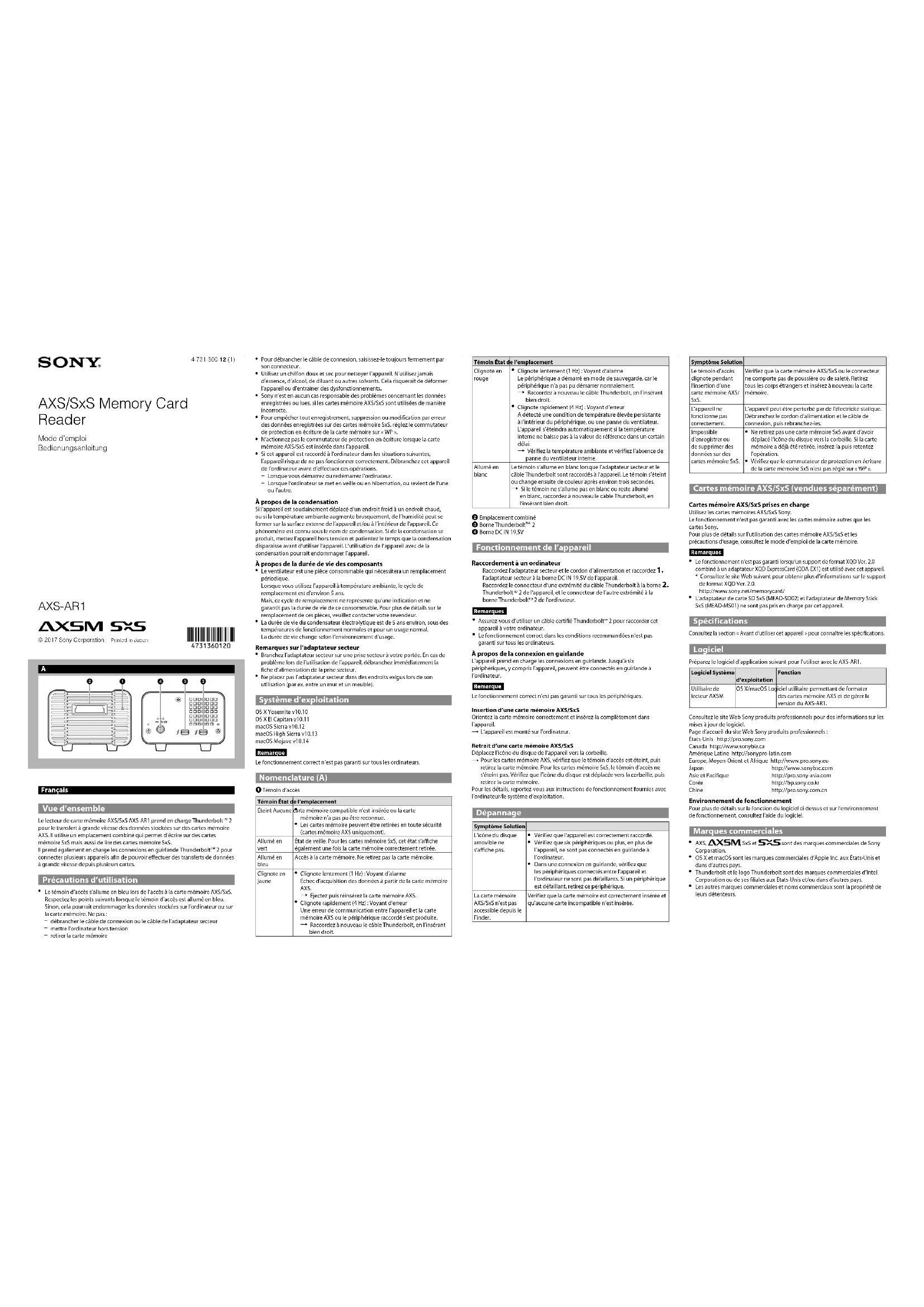 - Consultez le site Web suivant pour obtenir plus d’informations sur le support de format XQD Ver. 2.0. http://www.sony.net/memorycard/ L’adaptateur de carte SD SxS (MEAD-SD02) et l’adaptateur de Memory Stick SxS (MEAD-MS01) ne sont pas pris en charge par cet appareil. Spécifications Consultez la section « Avant d’utiliser cet appareil » pour connaître les spécifications. Logiciel Préparez le logiciel d’application suivant pour l’utiliser avec le AXS-AR1.Logiciel Système d’exploitationFonctionUtilitaire de lecteur AXSMOS X/macOS Logiciel utilitaire permettant de formater des cartes mémoire AXS et de gérer la version du AXS-AR1.Consultez le site Web Sony produits professionnels pour des informations sur les mises à jour de logiciel.Page d’accueil du site Web Sony produits professionnels :États-Unis http://pro.sony.comCanada http://www.sonybiz.caAmérique Latine http://sonypro-latin.comEurope, Moyen-Orient et Afrique http://www.pro.sony.euJapon http://www.sonybsc.comAsie et Pacifique http://pro.sony-asia.comCorée http://bp.sony.co.krChine http://pro.sony.com.cnEnvironnement de fonctionnementPour plus de détails sur la fonction du logiciel ci-dessus et sur l’environnement de fonctionnement, consultez l’aide du logiciel. Marques commerciales AXS, , SxS et sont des marques commerciales de Sony Corporation.OS X et macOS sont les marques commerciales d’Apple Inc. aux États-Unis et dans d’autres pays.Thunderbolt et le logo Thunderbolt sont des marques commerciales d’Intel Corporation ou de ses filiales aux États-Unis et/ou dans d’autres pays.Les autres marques commerciales et noms commerciaux sont la propriété de leurs détenteurs. AXS/SxS Memory Card Reader Mode d’emploi Bedienungsanleitung