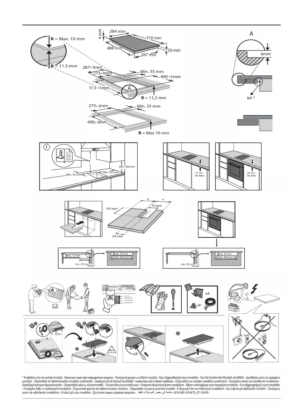 peut générer un son lorsque quelque chose est laissé sur le panneau de commande. Éteignez-la en agissant sur le bouton MARCHE/ARRÊT. INSTALLATION Deux personnes minimum sont nécessaires pour déplacer et installer l’appareil - risque de blessure. Utilisez des gants de protection pour le déballage et l’installation de l’appareil - vous risquez de vous couper. L’installation, incluant l’alimentation en eau (selon le modèle), et les connexions électriques, ainsi que les réparations, doivent être exécutées par un technicien qualié. Ne procédez à aucune réparation ni à aucun remplacement de pièce sur l’appareil autre que ceux spéciquement indiqués dans le guide d’utilisation. Gardez les enfants à l’écart du site d’installation. Après avoir déballé l’appareil, assurez-vous qu’il n’a pas été endommagé pendant le transport. En cas de problème, contactez le détaillant ou le service Après- vente le plus proche. Une fois installé, gardez le matériel d’emballage (sacs en plastique, parties en polystyrène, etc.) hors de la portée des enfants - ils pourraient s’étouer. L’appareil ne doit pas être branché à l’alimentation électrique lors de l’installation - vous pourriez vous électrocuter. Au moment de l’installation, assurez-vous que le câble d’alimentation n’est pas endommagé par l’appareil - risque d’incendie ou de choc électrique. Allumez l’appareil uniquement lorsque l’installation est terminée. Découpez le contour du meuble avant d’y insérer l’appareil, et enlevez soigneusement tous les copeaux et la sciure de bois. Si l’appareil n’est pas installé au-dessus d’un four, un panneau séparateur (non compris) doit être installé dans le compartiment sous l’appareil.ALIMENTATION ÉLECTRIQUE Il doit être possible de débrancher l’appareil de l’alimentation électrique en retirant la che de la prise de courant si elle est accessible, ou à l’aide d’un interrupteur multipolaire en amont de la prise de courant, conformément aux normes de sécurité électrique nationales. Utilisez pas de rallonge, de prises multiples ou d’adaptateurs. Une fois l’installation terminée, l’utilisateur ne devra plus pouvoir accéder aux composantes électriques. N’utilisez pas l’appareil si vous êtes mouillé ou si vous êtes pieds nus. N’utilisez pas l’appareil si le câble d’alimentation ou la prise de courant est endommagé(e), si l’appareil ne fonctionne pas correctement, ou s’il a été endommagé ou est tombé. Une installation utilisant une prise de câble électrique n'est pas autorisée sauf si le produit en est déjà équipé par le Fabricant. Si le câble d’alimentation est endommagé, il doit être remplacé avec un câble identique par le fabricant, un représentant du Service Après-vente, ou par toute autre personne qualiée - vous pourriez vous électrocuter.