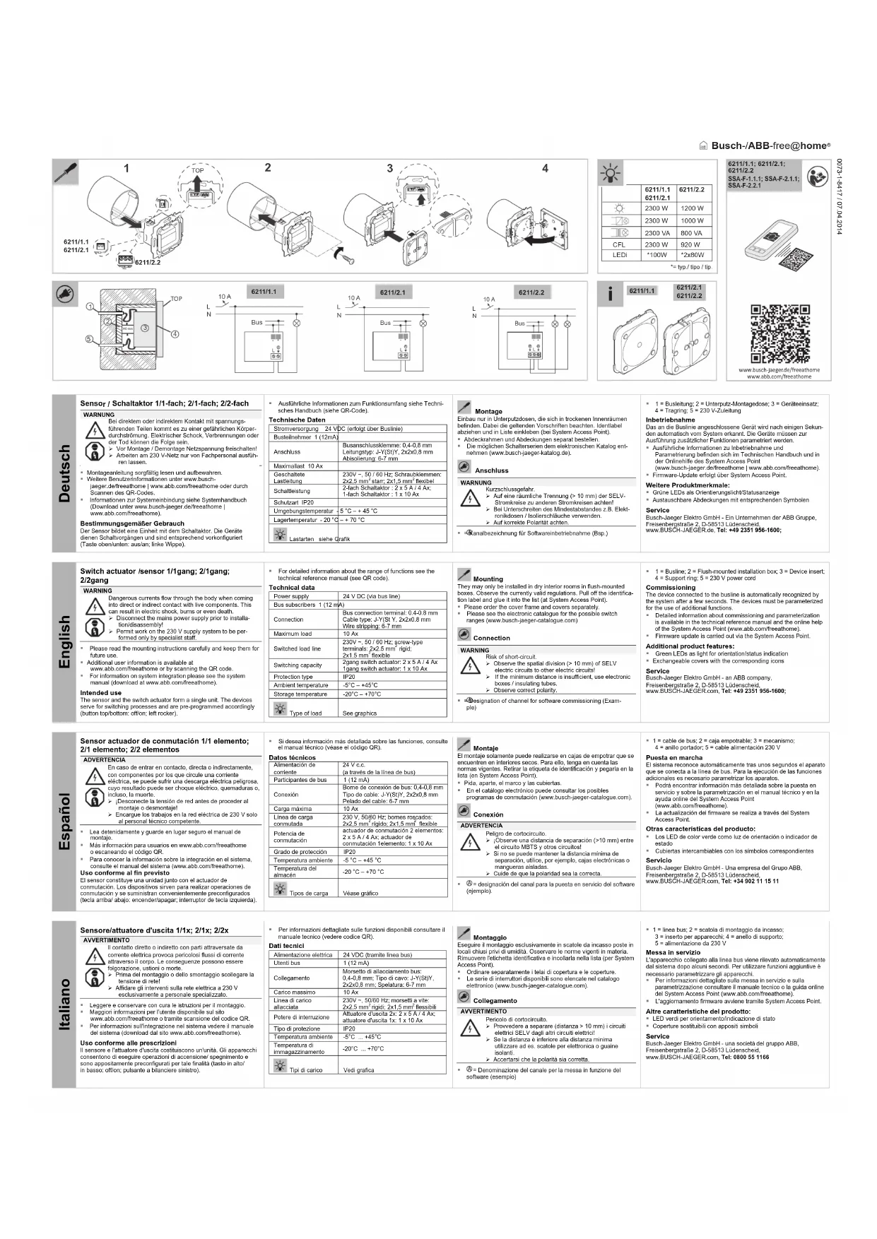 Un contact direct ou indirect avec des pièces sous tension entraîne un passage de courant dangereux dans le corps. Celui-ci risque d’entraîner un choc électrique, des brûlures ou la mort. Déconnecter la tension secteur avant tout montage / démontage ! Faire réaliser toute intervention sur l'alimentation électrique en 230 V uniquement par des techniciens spécialisés ! Les instructions de montage sont à lire attentivement et à conserver. Des informations utilisateurs supplémentaires sont disponibles sur le site www.abb.com/freeathome ou en scannant le code QR. Pour des informations sur l’intégration du système, voir le manuel système (téléchargeable sur le site www.abb.com/freeathome). Utilisation conforme Le capteur et l’actionneur de commutation forment un tout. Ces appareils servent à la commutation et sont préconfigurés en consé-quence (touche haut/ bas : arrêt/marche ; bouton-poussoir gauche). Des informations détaillées sur la gamme des fonctions sont disponibles dans le manuel technique (voir le code QR). Caractéristiques techniques Alimentation électrique 24 VDC (via la ligne bus) Participant au bus 1 (12mA) Raccordement Borne de raccordement du bus : 0,4-0,8 mm; Type de câble : J-Y(St)Y, 2x2x0,8 mm; Dénudé sur : 6-7 mm Charge maximale 10 Ax Ligne de charge couplée 230V ~, 50 / 60 Hz ; bornes à vis : 2x2,5 mm rigide ; 2x1,5 mm flexible Puissance de coupure Actionneur de commutation double 2 x 5 A / 4 Ax ; Actionneur de commutation simple 1 x 10 Ax Type de protection IP20 Température ambiante -5 °C – +45 °C Température de stockage -20 °C – +70 °C Types de charge Voir graphique Montage Montage uniquement dans des boîtes encastrées se trouvant dans des pièces intérieures non humides. Respecter les prescriptions en vigueur lors de l’opération. Enlever l’étiquette d’identification et la coller sur la liste (au niveau du System Access Point). Commander séparément la plaque de recouvrement et les caches. Les programmes de commutateurs possibles sont disponibles dans le catalogue électronique (www.busch-jaeger-catalogue.com). Raccordement AVERTISSEMENT