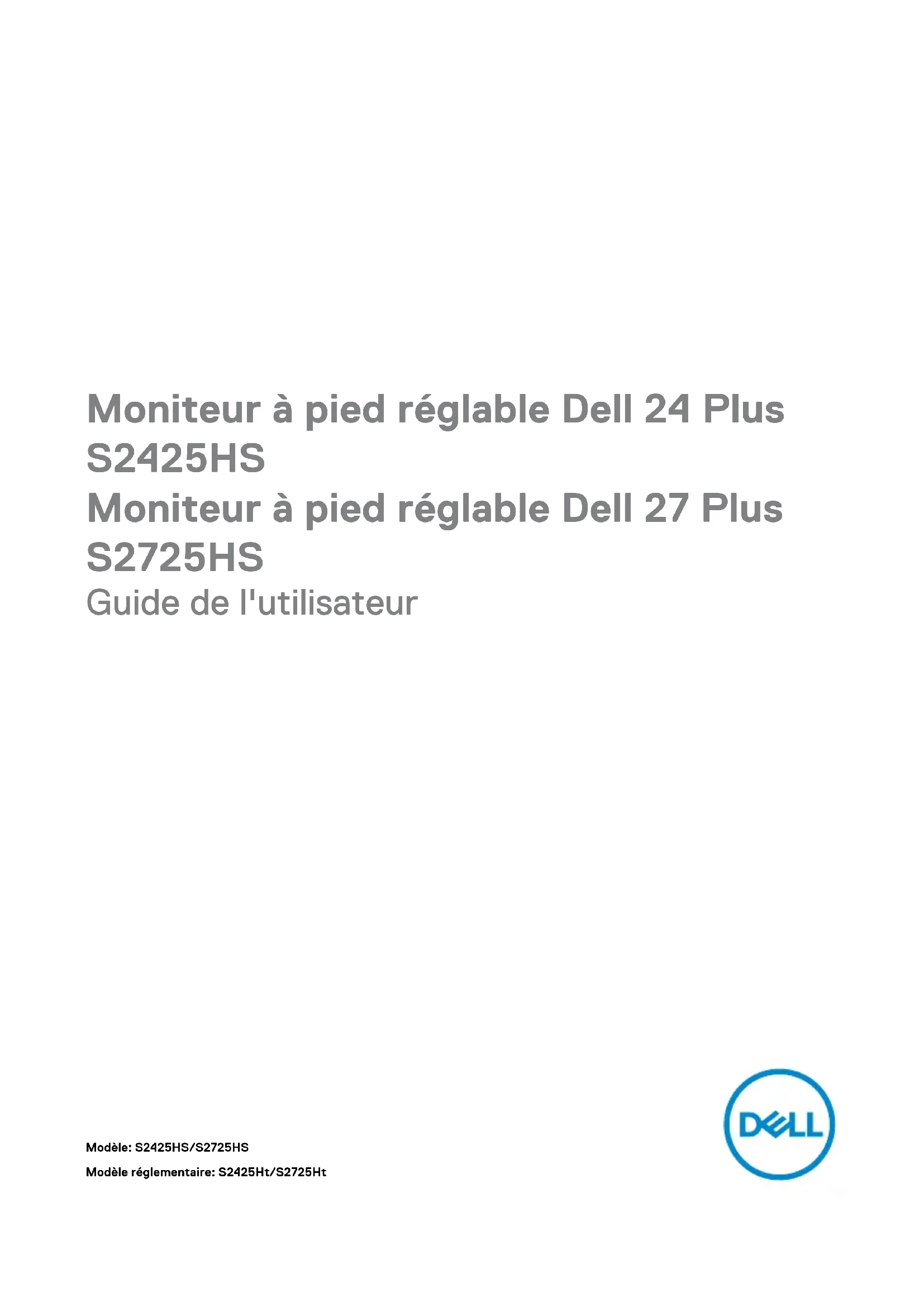Modèle: S2425HS/S2725HS Modèle réglementaire: S2425Ht/S2725Ht Moniteur à pied réglable Dell 24 Plus S2425HS Moniteur à pied réglable Dell 27 Plus S2725HS Guide de l'utilisateurREMARQUE : Une REMARQUE indique des informations importantes qui vous aident à mieux utiliser votre ordinateur. ATTENTION : Une MISE EN GARDE indique soit un dommage potentiel au matériel, soit une perte de données et vous indique comment éviter le problème.