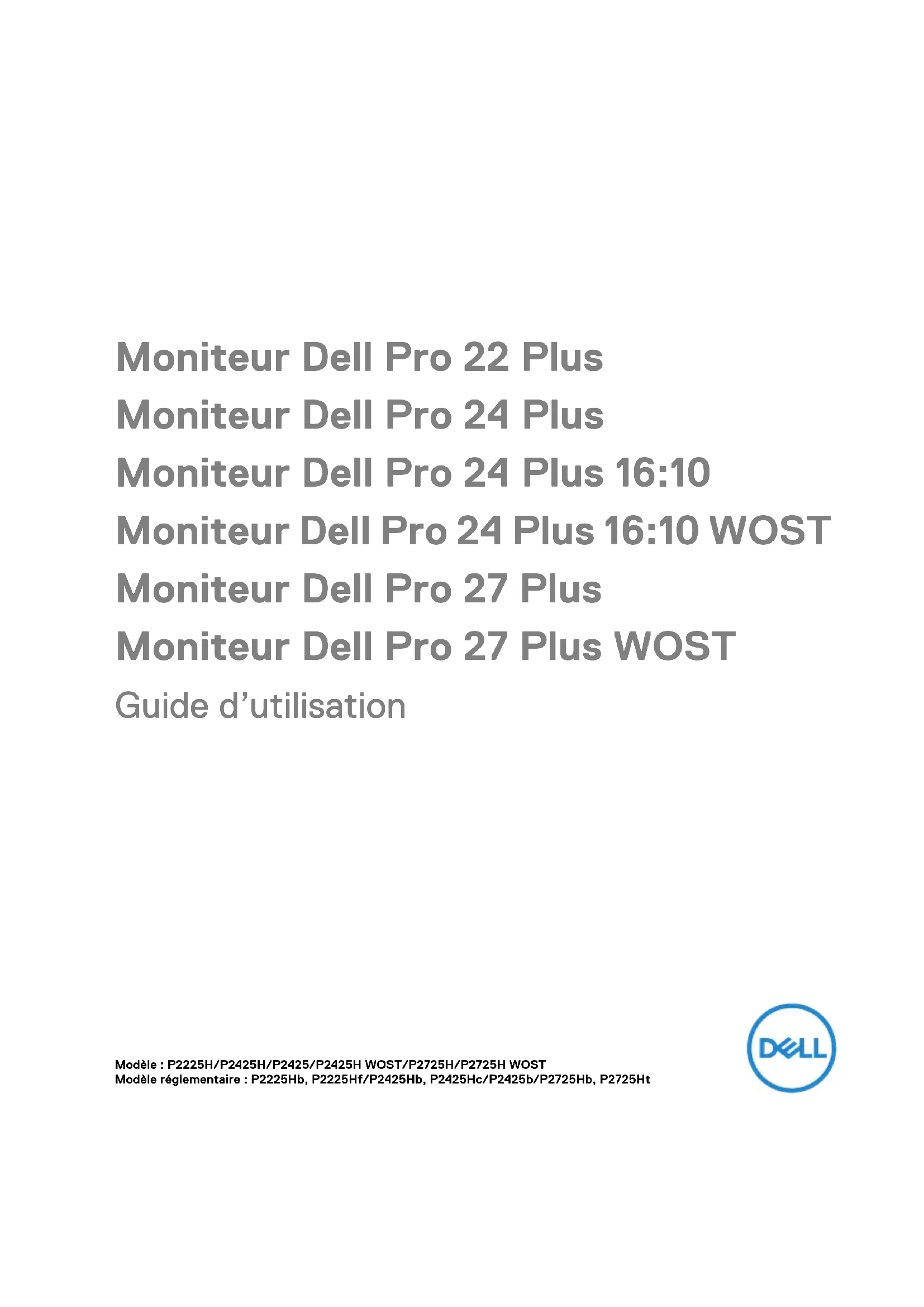 Moniteur Dell Pro 22 Plus Moniteur Dell Pro 24 Plus Moniteur Dell Pro 24 Plus 16:10 Moniteur Dell Pro 24 Plus 16:10 WOST Moniteur Dell Pro 27 Plus Moniteur Dell Pro 27 Plus WOST Guide d’utilisation Modèle : P2225H/P2425H/P2425/P2425H WOST/P2725H/P2725H WOST Modèle réglementaire : P2225Hb, P2225Hf/P2425Hb, P2425Hc/P2425b/P2725Hb, P2725HtREMARQUE : Une REMARQUE indique des informations importantes qui vous aideront à mieux utiliser votre ordinateur.
