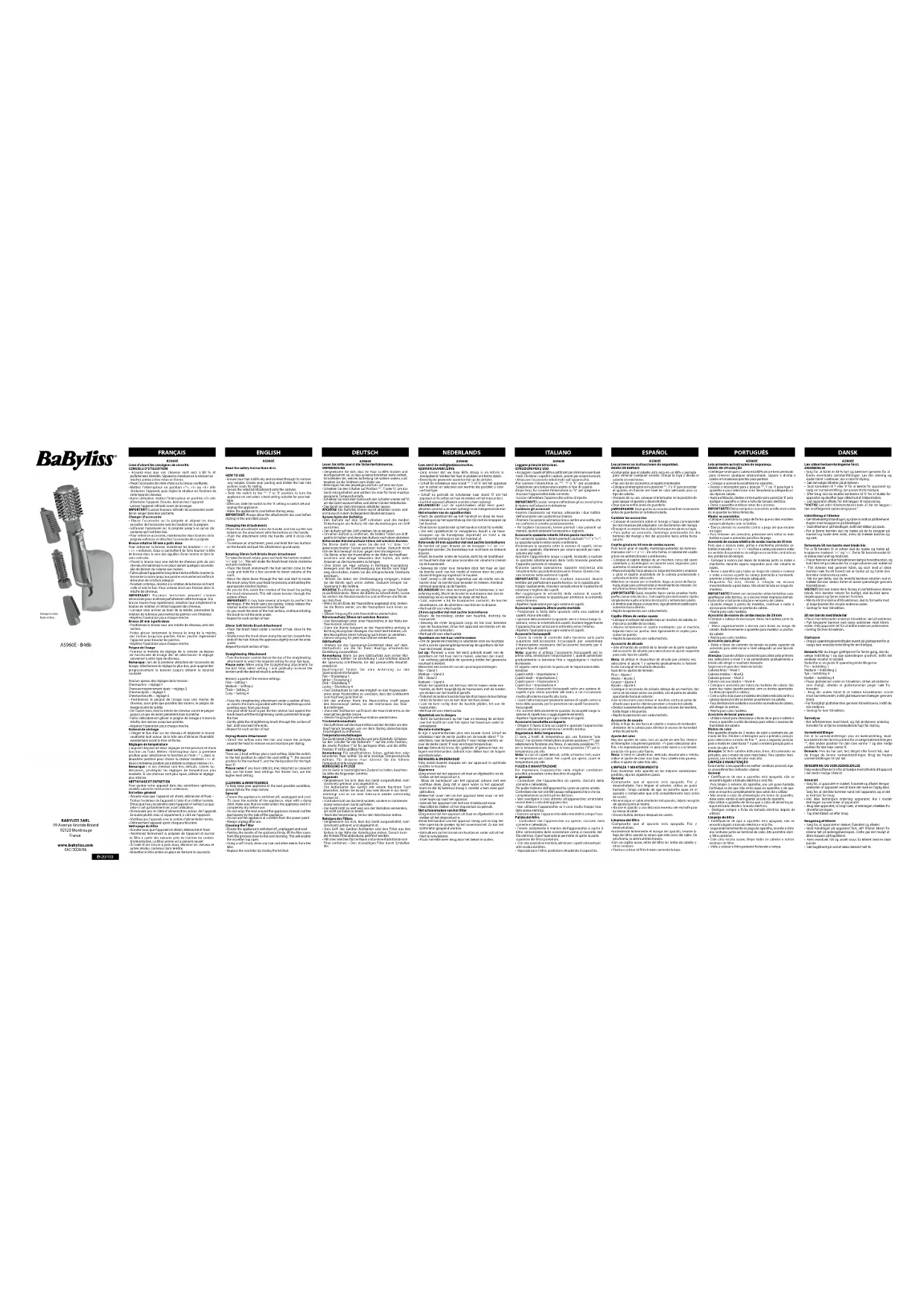 Retrouvez gratuitement la notice de l'appareil Beliss Big Hair 1000 AS960E BABYLISS au format PDF.