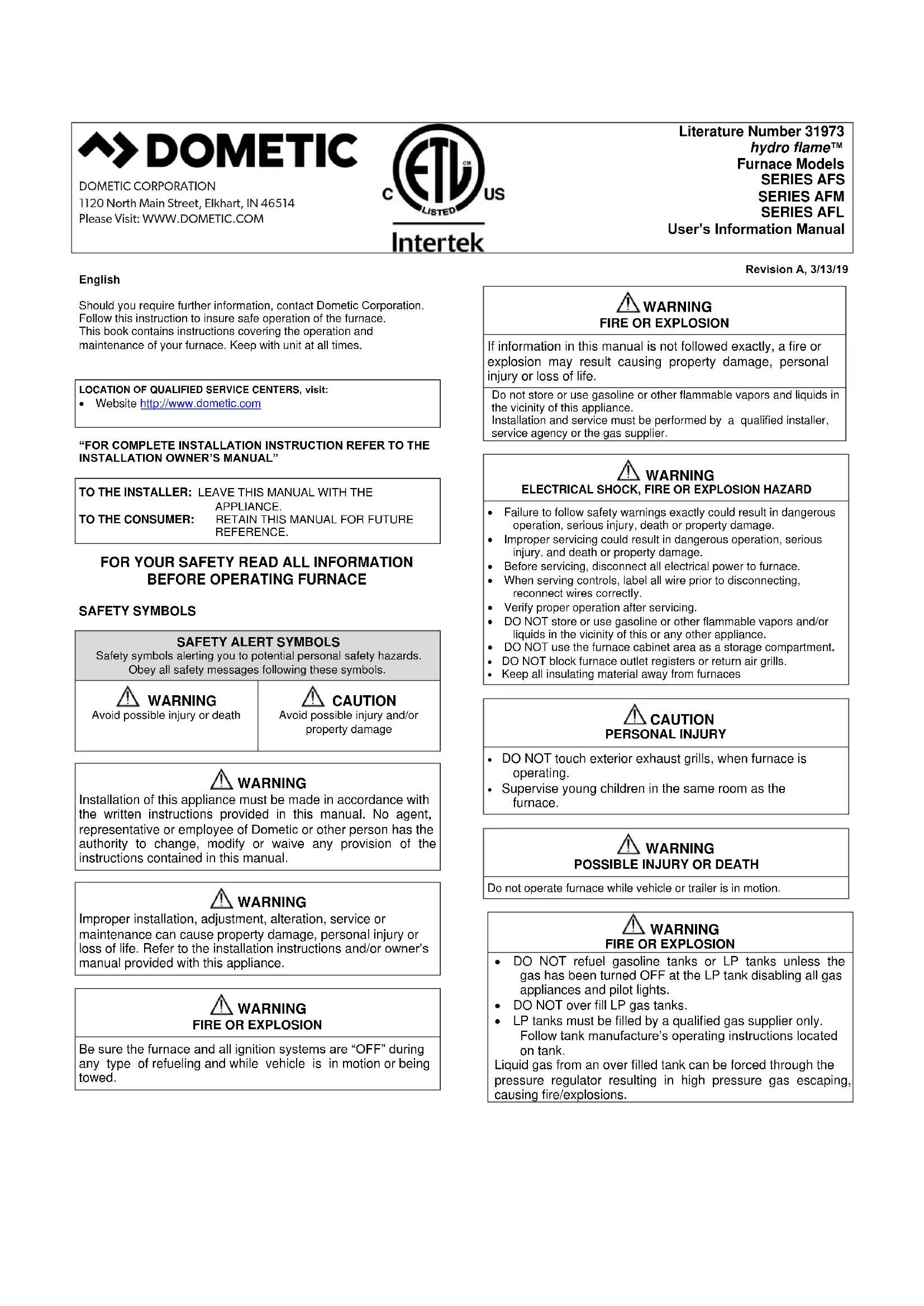 SERIE AFL Manuel d'information pour l'utilisateur Français (ET Canada) Si vous souhaitez plus d'informations, contactez Dometic Corporation. Suivez ces informations pour garantir une utilisation en toute sécurité de la fournaise.. Ce document contient des instructions décrivant le fonctionnement et l'entretien de votre fournaise. Conservez-le avec votre unité en tout temps.