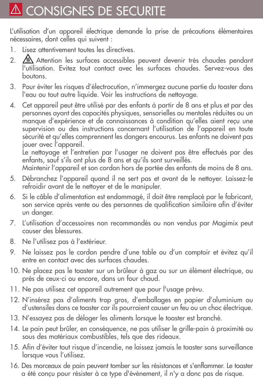 15. Afin d’éviter tout risque d’incendie, ne laissez jamais le toaster sans surveillance