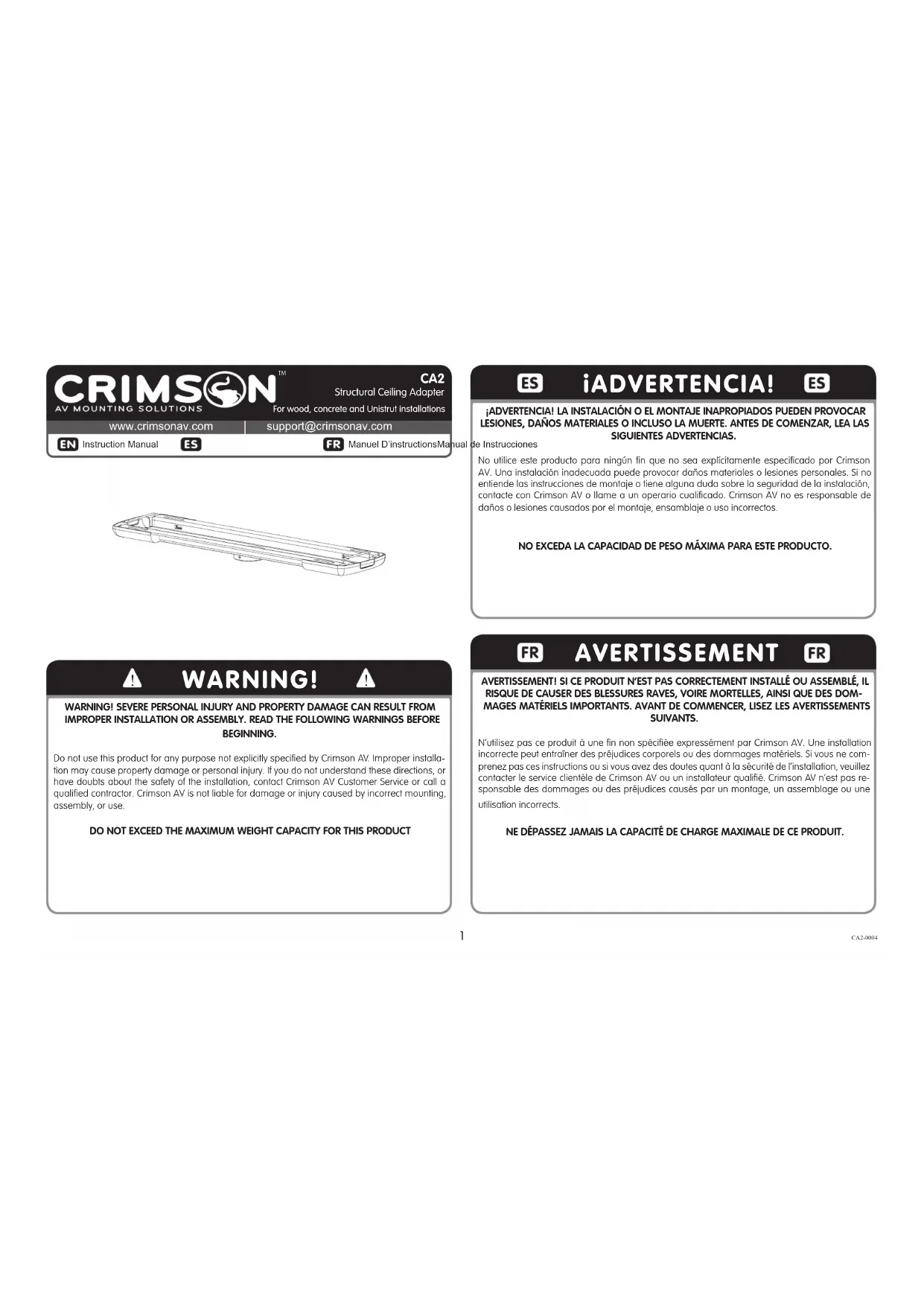 Nous vous félicitons pour l’achat de ce produit Crimson! Vous venez d’acquérir un produit réalisé à partir de matériaux durables et d’une conception ingénieuse jusque dans les moindres détails. Crimson AV LLC est ainsi en mesure de garantir ses produits pendant 10 ans contre les défauts de matériaux et de fabrication. Crimson AV LLC rejette toute responsabilité relativement à quelque problème pouvant être associé à une modification d’un produit, à une mauvaise installation ou à une installa- tion ne respectant pas les limites de charge. Sous réserve des lois en vigueur, Crimson AV LLC réfute toute autre garantie expresse ou implicite, notamment toute garantie de com- mercialisation ou de convenance à un usage quelconque. Crimson AV LLC réfute toute responsabilité pour des dommages résultant de l’utilisation ou de l’impossibilité d’utiliser des produits Crimson AV LLC. Crimson AV LLC réfute également toute responsabilité pour quelque dommage accessoire ou indirect. Ceci s’applique notamment aux frais de main d’oeuvre pour la réparation de produits Crimson AV LLC par une personne ne travaillant pas pour Crimson AV LLC. Les spécifications sont sujettes à changement sans préavis. GARANTIE NOTICE TO CUSTOMERS OUTSIDE THE UNITED STATES: CRIMSON PRODUCT WARRANTY APPLIES ONLY TO PRODUCTS PURCHASED IN THE UNITED STATES. FOR PURCHASES OUTSIDE OF THE UNITED STATES, PLEASE CONTACT YOUR COUNTRIES DISTRIBUTOR FOR COUNTRY SPECIFIC WAR-RANTY INFORMATION.AVISO PARA CLIENTES QUE SE ENCUENTREN FUERA DE LOS EE.UU: LA GARANTÍA DEL PRODUCTO DE CRIMSON TIENE VALIDEZ SÓLO PARA LAS COMPRAS REALIZADAS EN LOS EE.UU. SI REALIZÓ LA COMPRAEN EL EXTERIOR, COMUNÍQUESE CON EL DISTRIBUIDOR DE SU PAÍS PARA OBTENER INFORMACIÓN ESPECÍFICA ACERCA DE LAGARANTÍA EN ESE PAÍS.AVIS AUX CLIENTS DE L’EXTÉRIEUR DES ÉTATS-UNIS: CETTE GARANTIE DE PRODUIT CRIMSON S’APPLIQUE UNIQUEMENT AUX PRODUITS ACHETÉS AUX ÉTATS-UNIS. SI VOTRE PRODUIT A ÉTÉ ACHETÉ À L’EXTÉRIEUR DES ÉTATS-UNIS, LE DISTRIBUTEUR DEVOTRE PAYS POURRA VOUS RENSEIGNER SUR LES DÉTAILS DE LA GARANTIE APPLICABLE. WARRANTY CONTINUED