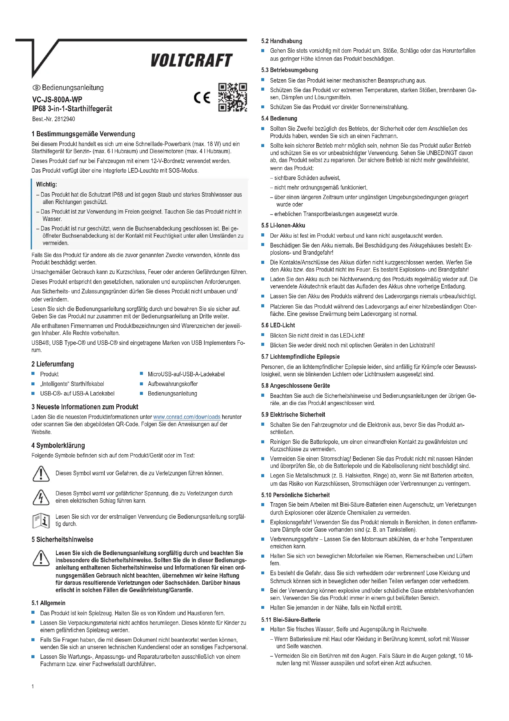 - V/DC Start current (peak value) A (800 A) Jump starts approx. 15 (affected by factors such as ambient temperature, size, and mechanical condition of the engine) Suitable engine types Petrol (displacement ≤6.0 L), Diesel (displacement ≤4.0 L) This is a publication by Conrad Electronic SE, Klaus-Conrad-Str. 1, D-92240 Hirschau (www.conrad.com). All rights including translation reserved. Reproduction by any method (e.g. photocopying, microfilming or the capture in electronic data processing systems) requires prior written approval from the editor. Reprinting, also in part, is prohibited. This publication reflects the technical status at the time of printing. Copyright by Conrad Electronic SE. *2812940_V2_0823_dh_mh_en 9007200149572235-2 I2/O2 en7 Mode d’emploi VC-JS-800A-WP Démarreur de secours 3-en-1 IP68 N° de commande 2812940 1 Utilisation prévue Ce produit est une batterie externe à recharge rapide (max. 18W) et un système de démar- rage rapide de véhicule pour les moteurs à essence (max. 6L) et diesel (max. 4L). Ce produit ne doit être utilisé qu’avec des véhicules équipés d’un système 12V. Le produit dispose d’un voyant LED intégré avec mode SOS. Important: – Le produit dispose d’un indice de protection IP68 et est protégé contre la poussière et les jets d’eau puissants provenant de toutes les directions. – Le produit est adapté à une utilisation en extérieur. Ne plongez pas le produit dans l’eau. – Le produit n’est protégé que lorsque le cache des prises est fermé. Le contact avec l’humidité doit être évité en toutes circonstances si le cache des prises est ouvert. Toute utilisation à des fins autres que celles décrites pourrait endommager le produit. Une mauvaise utilisation peut entraîner des risques tels que des courts-circuits, des incen- dies, etc. Ce produit est conforme aux exigences nationales et européennes en vigueur. Pour des raisons de sécurité et d’homologation, toute restructuration et/ou modification du produit est interdite. Lisez attentivement les instructions du mode d’emploi et conservez-le dans un endroit sûr. Ne mettez ce produit à la disposition de tiers qu’avec son mode d’emploi. Tous les noms d’entreprises et appellations de produits sont des marques commerciales de leurs propriétaires respectifs. Tous droits réservés. USB4®, USB Type-C® et USB-C® sont des marques déposées de l'USB Implementers Fo- rum. 2 Contenu de l'emballage p. 400