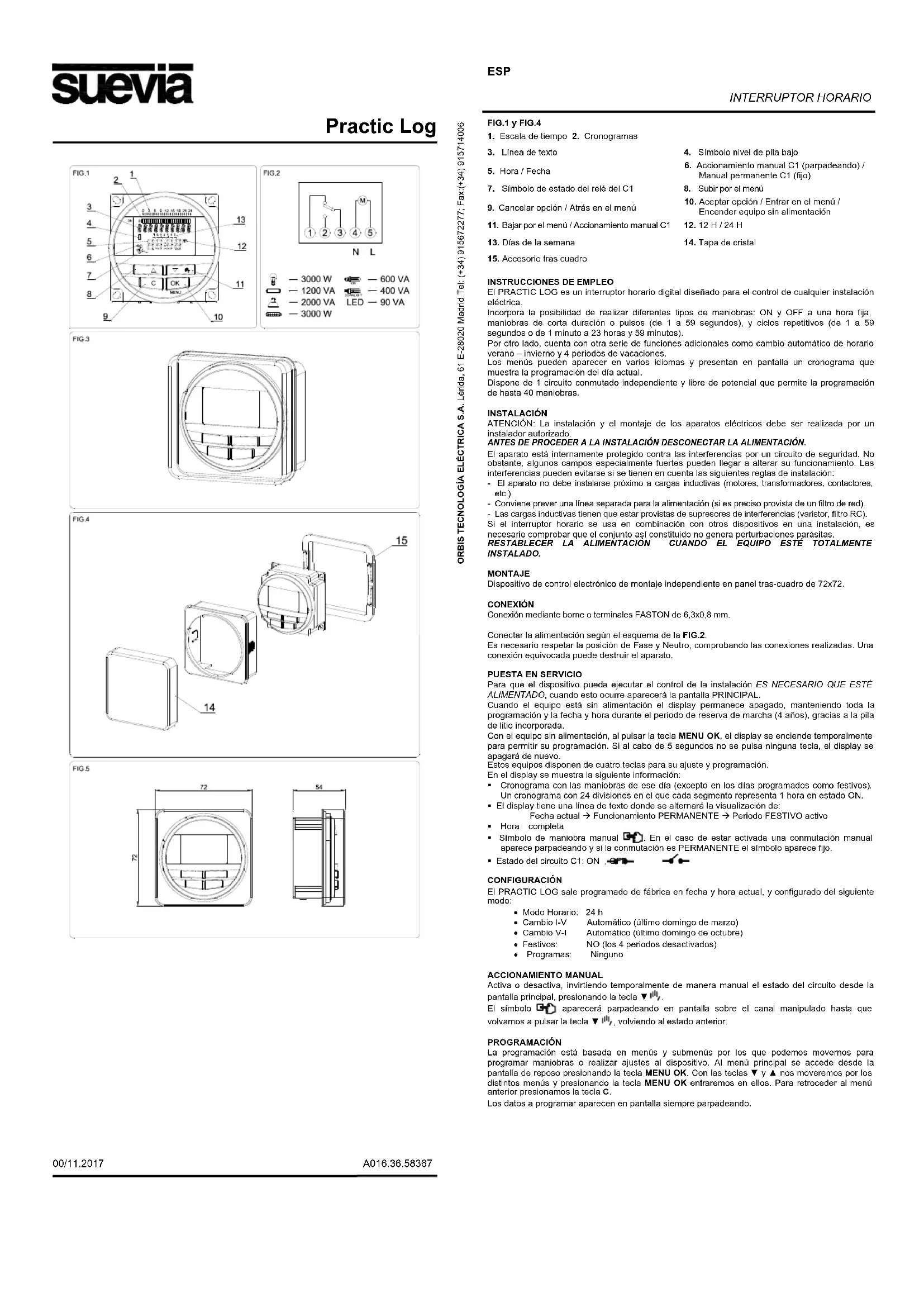 Le PRACTIC LOG est un interrupteur horaire numérique conçu pour le contrôle de n’importe quelle installation électrique. Il incorpore la possibilité de réaliser différents types de manœuvres : ON et OFF à une heure fixe, des manœuvres de courte durée ou des pulsations (de 1 à 59 secondes), et des cycles répétitifs (de 1 à 59 secondes) ou de 1 minute à 23 heures et 59 minutes). D'autre part, il dispose d'une autre série de fonctions additionnelles comme changement automatique d’horaire d'été – hiver e 4 périodes de vacances. Les menus peuvent apparaître en plusieurs langues et ils présentent à l’écran un chronogramme qui montre la programmation du jour actuel. Il dispose de 1 circuit commué indépendant et libre de potentiel qui permet la programmation de jusqu'à 40 manœuvres. INSTALLATION ATTENTION : L'installation et le montage des appareils électriques doivent être réalisés par un installateur autorisé. AVANT DE PROCÉDER À L'INSTALLATION DÉCONNECTER L'ALIMENTATION. L'appareil est internement protégé contre les interférences par un circuit de sécurité. Cependant, certains champs particulièrement forts peuvent arriver à altérer son fonctionnement. Les interférences peuvent être évitées si l’on tient en compte les règles d'installation suivantes : - L'appareil ne doit pas s'installer près de charges inductives (moteurs, transformateurs, contacteurs, etc.) - Il convient de prévoir une ligne séparée pour l'alimentation (si cela est nécessaire, pourvue d'un filtre de réseau). - Les charges inductives doivent être pourvues de suppresseurs d’interférences (varistor, filtre RC). Si l'interrupteur horaire s'emploie en combinaison avec d'autres dispositifs dans une installation, il est nécessaire de vérifier que l’ensemble ainsi constitué ne génère pas de perturbations parasites. RÉTABLIR L'ALIMENTATION QUAND L'ÉQUIPEMENT SERA TOTALEMENT INSTALLÉ. MONTAGE Dispositif de contrôle électronique de montage indépendant in saille encastré 72x72. Montage sur rail DIN avec kit d'installation supplémentaire voir art. non. 191497 CONNEXION Bornier ou FASTON de 6,3x0,8 mm. Connecter l'alimentation selon le schéma de la FIG.2. Il est nécessaire de respecter la position de Phase et Neutre, en vérifiant les connexions réalisées. Une connexion erronée peut détruire l'appareil.