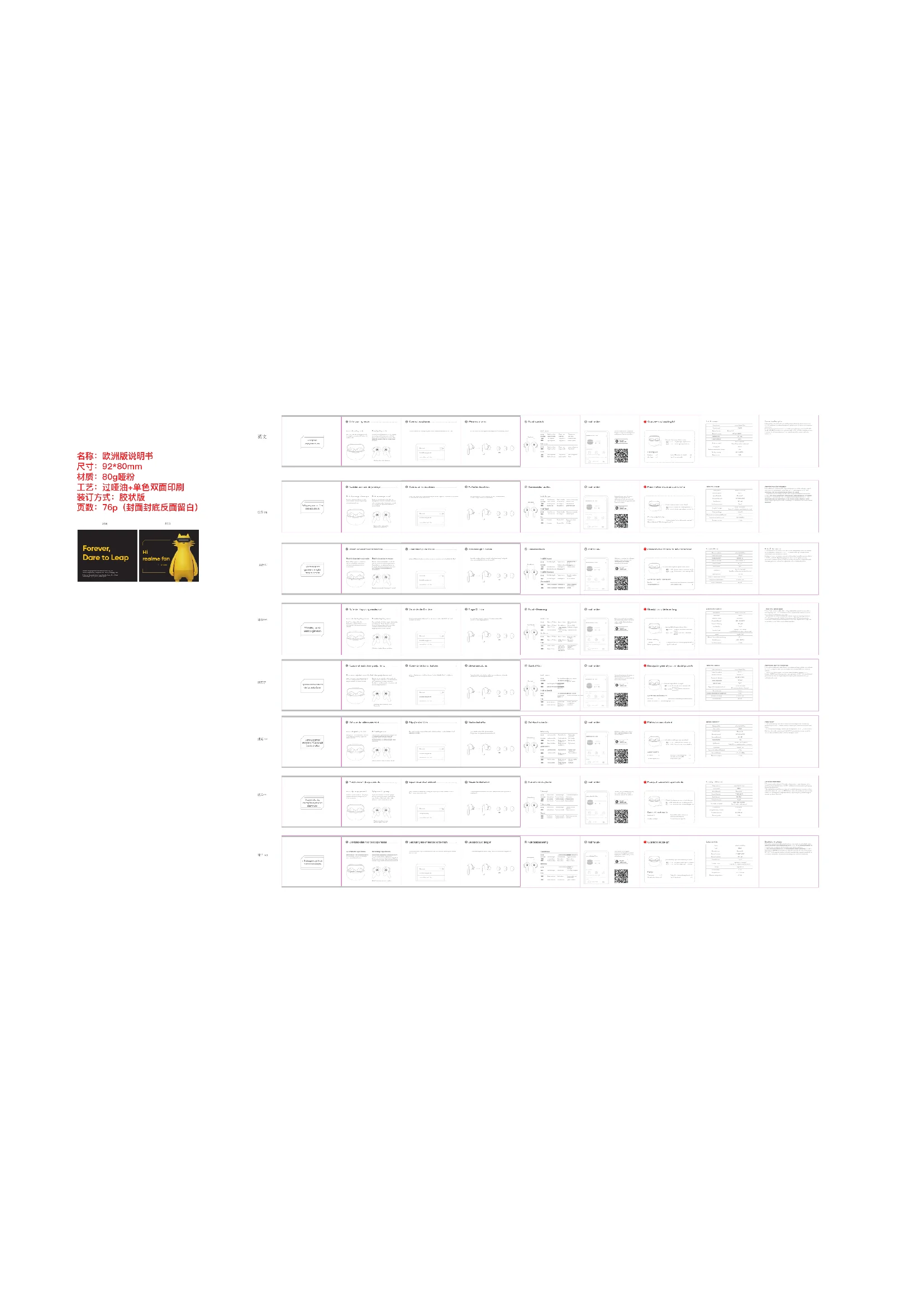 Accéder au mode de jumelage Connecter les écouteurs Maintenez les doigts sur les 2 écouteurs pendant 5 s Première utilisation : Ouvrez le boîtier des écouteurs. Le mode de jumelage automatique se lance.Activez le Bluetooth sur votre smartphone, recherchez l’appareil « realme Buds Air 3 Neo » et connectez-les à votre smartphone.Vous pouvez choisir la taille d’embouts qui vous convient le mieux. (la taille M est par défaut sur les écouteurs)Scannez le code pour télécharger l’application et profitez d’une expérience musicale améliorée, ainsi que de fonctionnalités supplémentaires pour vos écouteurs. Le témoin vert s’allume pendant 10 sLe témoin rouge s’allume pendant 10 s> 20 %< 20 % 3 étapes pour profiter des écouteurs Accéder au mode de jumelageAvailable equipmentrealme Buds Air 3 Neobass boost balanced bright mode game modesound effectconnected100% 100% Bass Paramètres de base Nom du produitModèle du produit RMA2113Version BluetoothBluetooth 5.2Protocole Bluetooth HFP/A2DP/AVRCPCode Bluetooth SBC, AACInterface de recharge Type CLongévité (musique)Environ 7 h (écouteurs)Environ 30 h (utilisation avec le boîtier de charge)Durée de rechargeDistance de communication du BluetoothFréquence en fonctionnementPuissance maximaleEnviron 2 h 2 402~2 480 MHz<10 dBmrealme Buds Air 3 Neo≤ 10 m Informations sur la température 1. Ce produit contient une batterie. S’il n’est pas utilisé pendant une période prolongée, rangez-le dans un lieu où la température est comprise entre 0 et 35 °C, et rechargez-le tous les 3 mois minimum pour éviter toute dégradation des performances de la batterie.2. Utilisez les écouteurs ou rechargez-les dans un lieu à la température normale (comprise entre 0 et 45 °C avec un taux d’humidité compris entre 45 et 85 %). Les écouteurs peuvent être rechargés rapidement s’ils se trouvent dans un lieu où la température est comprise entre 15 et 45 °C. Si la température du lieu où se trouve le produit se trouve hors de la plage de températures définie comme sûre pour le produit, celui-ci peut s’endommager et les performances de la batterie peuvent se dégrader. realme Link Indossare gli auricolari S M L Comandi touch Panoramica e contenuto della confezione Contenuto della confezione Auricolari x 1 Manuale dell'utente x 1 Cavo di ricarica di tipo C x 1 Inserti auricolari (misura M montata di default) x 6Indicatore (coperchio aperto, non in ricarica)Bluetoothrealme Buds Air 3 Neo Modalità di associazione automatica Modalità di associazione manuale Estrarre i due auricolari dalla custodia di ricarica e premere contemporaneamente l’area di tocco con entrambe le mani per 5 secondi. Gli auricolari possono accedere alla modalità di associazione anche manualmente. Area di toccoDoppio toccoAuricolare singoloDoppio toccoAuricolare singoloPremere per 5sPremere per 10sEntrambi gli auricolariEntrambi gli auricolariProssima tracciaTriplo toccoAuricolare singolo Modalità musica Premere per 2sPremere per 3sPremere per 3sRifiuta chiamataAuricolare singolo Modalità Chiamata Auricolare sinistro Diminuisci volumeAuricolare destro Aumenta volume Altre modalità Ripristina
