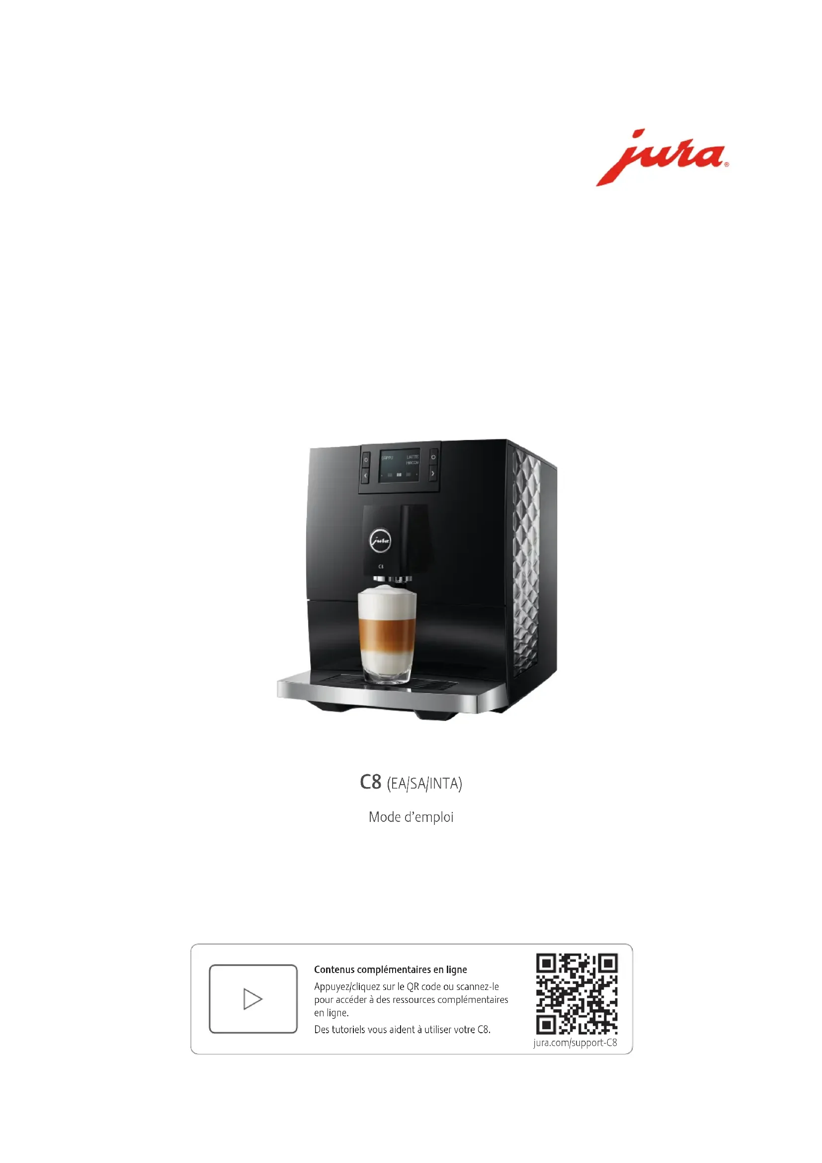 C8 (EA/SA/INTA) Mode d’emploi jura.com/support-C8 Contenus complémentaires en ligne Appuyez/cliquez sur le QR code ou scannez-le pour accéder à des ressources complémentaires en ligne. Des tutoriels vous aident à utiliser votre C8.Table des matières