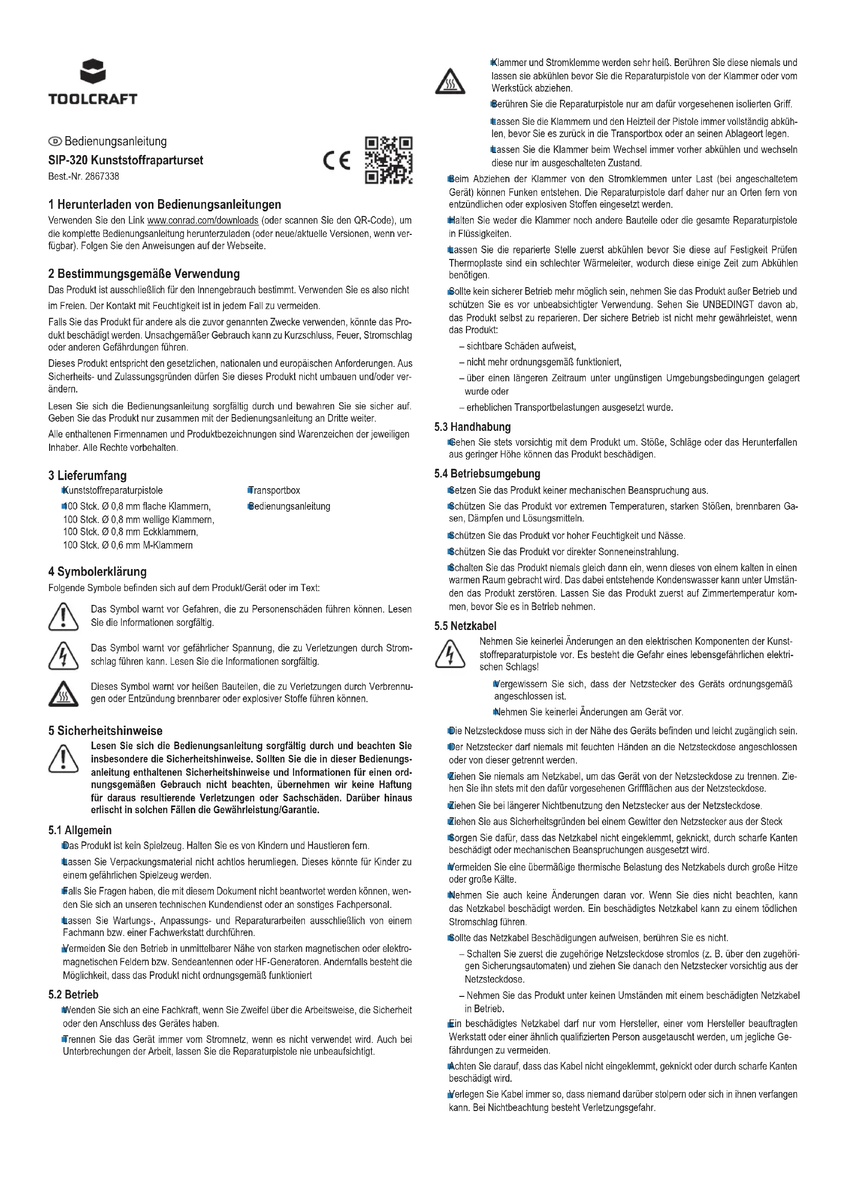 Dimensions (L x l x h) ................... 170 x 165 x 55 mm Longueur du câble de raccordement ................................ 140 cm Poids ............................................. env. 525 g Ceci est une publication de Conrad Electronic SE, Klaus-Conrad-Str. 1, D-92240 Hirschau (www.conrad.com). Tous droits réservés, y compris de traduction. Toute reproduction, quelle qu‘elle soit (p. ex. photocopie, microlm, saisie dans des installations de traitement de données) nécessite une autorisation écrite de l‘éditeur. Il est interdit de le réimpri- mer, même par extraits. Cette publication correspond au niveau technique du moment de la mise sous presse. Copyright 2023 by Conrad Electronic SE. *2867338_V2_1123_02_mh_dm_FR_(1) 6 Éléments de fonctionnement 1 Interrupteur On/Off 2 Éclairage LED lors du fonctionnement 3 Embout de soudure 4 Poignée 5 Agrafe 7 Manipulation Choisissez une agrafe appropriée et insérez-la dans l’embout de soudure du pistolet de répa- ration. Les broches de contact des agrafes sont légèrement plus larges que l’écart présenté par l’embout de soudage, de sorte qu'elles restent dans l’embout de par leur tension de ressort. Il n'est pas nécessaire de xer davantage l’agrafe, car celle-ci reste dans la pièce après le soudage et est retirée du pistolet. Pour chauffer les agrafes (5), maintenez le bouton marche/arrêt (1) enfoncé. L’agrafe est main- tenant chauffée par sa résistance électrique. 8 Recommandations pour la réparation de pièces en plastique Les plastiques ne doivent jamais être chauffés au-dessus de leur température de décompo- sition, car cela pourrait nuire considérablement à leurs propriétés mécaniques. Pour les ther- moplastiques, cette température se situe généralement entre 250°C et 320°C. Il est donc recommandé de ne pas chauffer les agrafes avant de les placer sur la pièce, mais de les mettre d'abord en place et de les chauffer ensuite. Grâce à la dissipation de la chaleur, la température peut être maintenue plus uniformément dans la zone de coulée. De grandes quantités de fumée indiquent une température trop élevée. Dans ce cas, appuyez sur la touche marche/arrêt par impulsions et faites fondre l’agrafe dans la pièce. Lorsque l’agrafe a fondu dans l'endroit souhaité, relâchez le bouton marche/arrêt et attendez 2 secondes jusqu'à ce que le thermoplastique ait refroidi et que l’agrafe reste en place dans la pièce. Après env. 1 min., le matériau a sufsamment refroidi et vous pouvez couper les contacts de l’agrafe à l'aide de la pince coupante fournie. Les matériaux plus épais sont plus faciles à traiter si vous faites fondre l’agrafe dans la pièce en effectuant un léger mouvement de rotation. Ceci permet de faciliter la fusion du matériau. Avec de longues ssures, il est plus facile de commencer par souder l'extrémité ouverte et de remonter ainsi jusqu’à clore la ssure. Soudez de l’extérieur jusqu’au milieu pour des ssures moins longues ou plusieurs compo- sants.