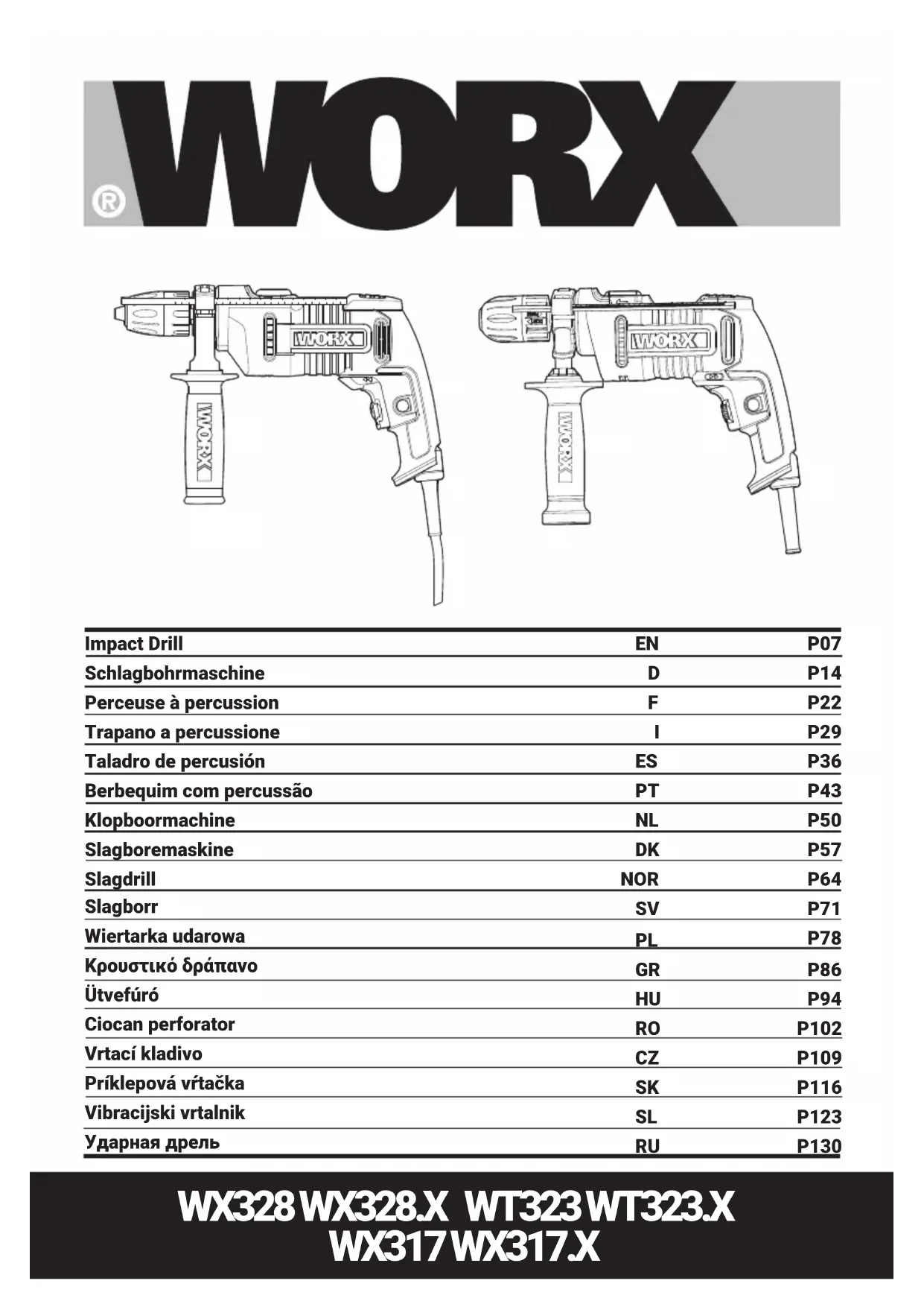 TECHNIQUES Modèle WX328 WX328.X WT323 WT323.X WX317 WX317.X(300-329- désignations des pièces, illustration de la Perceuse à percussion)2524 Perceuse à percussion F WX328 WX328.X WT323 WT323.X** WX317 WX317.X** Tension nominale 230-240V~50Hz Puissance nominale 810W 600 W Vitesse a vide nominale 3000r/min Cadence de frappe nominale 48000bpm Capacité du mandrin 13mm Capacité de perçage Maçonnerie 13mm 13mm Bois 30mm 25mm Acier 13mm 13mm Classe de protection /II Poids (Outil nu) 1.5kg 1.6kg ** X = 1-999, A-Z, M1-M9, la seule différence entre ces modèles est que les clients visés sont différents. Il n’y a pas de changement concernant la sécurité.