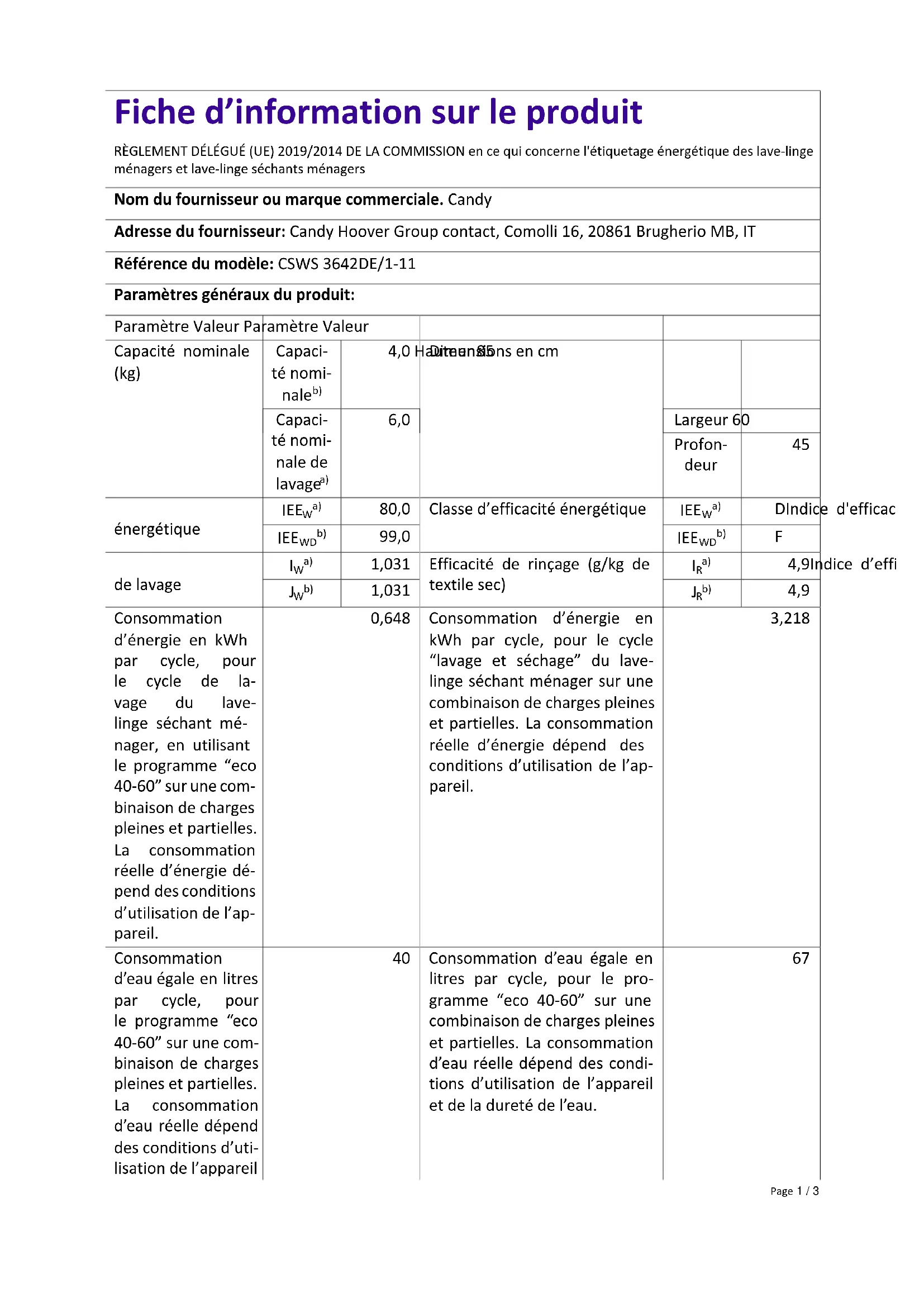 Fiche d’information sur le produit RÈGLEMENT DÉLÉGUÉ (UE) 2019/2014 DE LA COMMISSION en ce qui concerne l'étiquetage énergétique des lave-linge ménagers et lave-linge séchants ménagers Nom du fournisseur ou marque commerciale. Candy Adresse du fournisseur: Candy Hoover Group contact, Comolli 16, 20861 Brugherio MB, IT Référence du modèle: CSWS 3642DE/1-11 Paramètres généraux du produit: Paramètre Valeur Paramètre Valeur Capaci- té nomi- nale