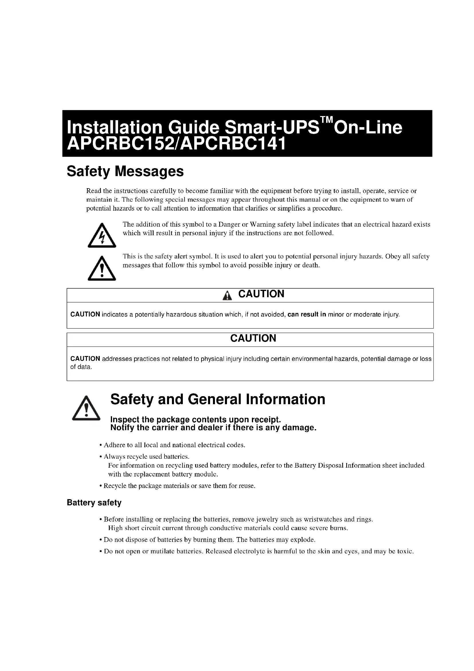 SAI Smart-UPS™On-Line APCRBC152/APCRBC141 5 APCRBC141 APCRBC152 x6Restablecimiento de la fecha de instalación de la batería Botón de ENCENDIDO/ APAGADO Icono de carga Icono de desactivación/silencio de la alarma sonora Información de estado del SAI Iconos del modo de funcionamiento Botón ESCAPE Botón Aceptar Botones de echa ARRIBA/ABAJO Iconos de estado de los grupos de tomas de corriente controlables Iconos de estado de la batería La fecha de instalación de la batería aparecerá en la interfaz de la pantalla en un plazo de dos minutos tras la instalación de la batería. Si la fecha de instalación no aparece en la interfaz de la pantalla, utilice los botones de echa ARRIBA/ABAJO para navegar hasta el menú Conguración > Batería e introduzca la Fecha de instalación correcta. Cuando el cartucho de la batería de repuesto (RBC), esté cargado al máximo de su capacidad, realice una Autocomprobación y una Prueba de calibración en tiempo de ejecución. Salida 230,0 V CARGA En línea Aceptar ESC su0870aGuide d’installation Smart-UPS™On-Line APCRBC152/APCRBC141 Messages de sécurité Lisez attentivement les instructions pour vous familiariser avec l’équipement avant de procéder à son installation, son utilisation, sa réparation ou son entretien. Ce manuel ou l’équipement peuvent comporter les messages spéciaux suivants pour signaler des risques potentiels ou attirer l’attention sur des informations qui clarient ou simplient une procédure. L’ajout de ce symbole à une étiquette de sécurité de type Danger ou Avertissement indique qu’il existe un risque électrique qui peut entraîner des blessures corporelles si les instructions ne sont pas suivies. C’est le symbole d’alerte de sécurité. Il est utilisé pour vous avertir des risques potentiels de blessures corporelles. Respectez tous les messages de sécurité qui suivent ce symbole pour éviter tout risque de blessure ou de décès. ATTENTION ATTENTION indique une situation potentiellement dangereuse qui, si elle n’est pas évitée, peut entraîner des blessures mineures ou modérées. ATTENTION ATTENTION concerne des pratiques qui ne présentent pas de risque de blessure physique, mais plutôt certains risques de pollution de l’environnement, de dommages potentiels ou de perte de données. Informations générales et de sécurité