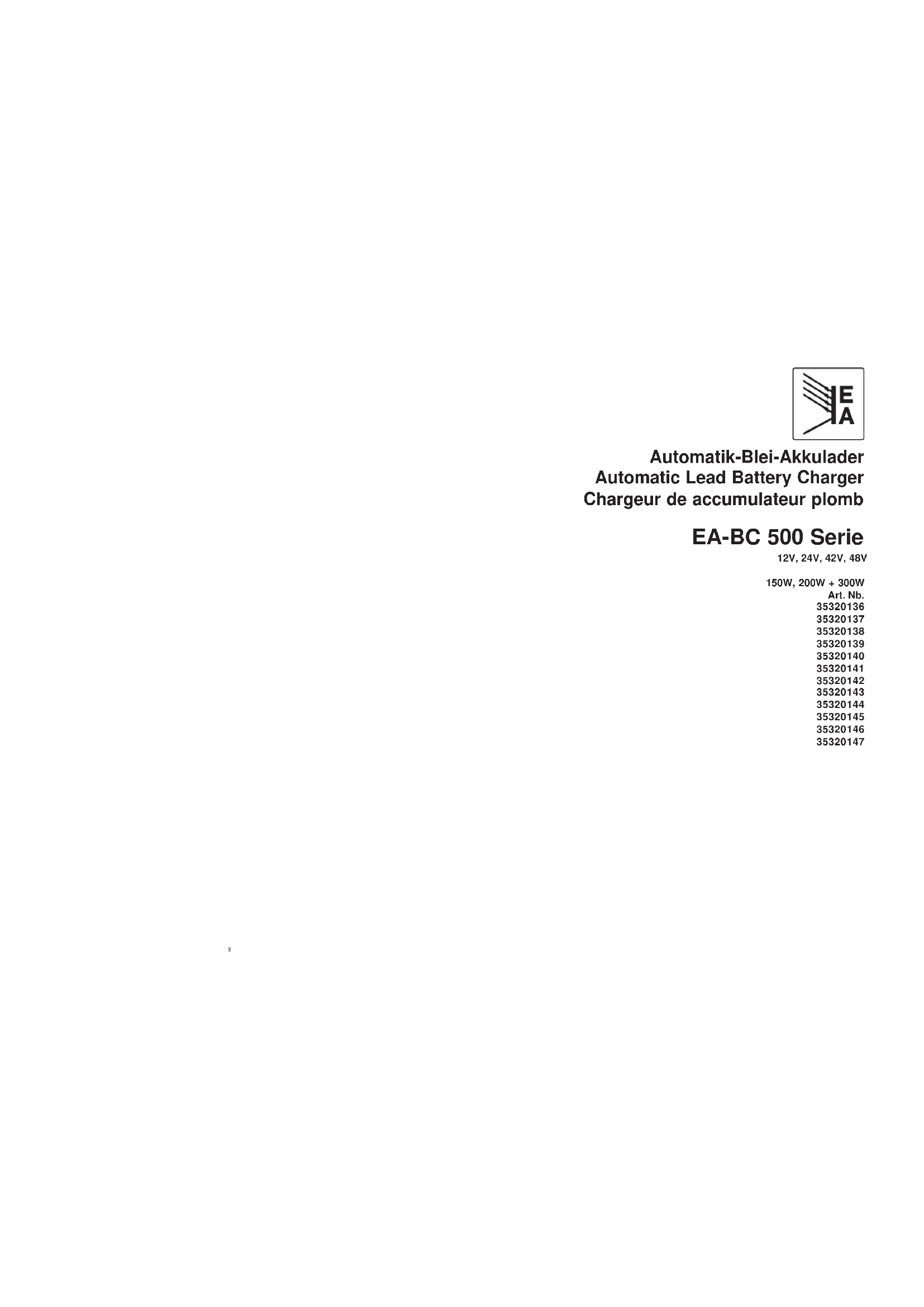 Ces chargeurs automatiques peuvent charger des ac- cumulateurs au plomb. Sur l'avant des appareils, la charge des batteries à charger est indiquée. Pour pratique vide la batterie briller le LED dans rouge la couleur, avec plein Batterie briller celui LED vert. Entre celui LED brille orange. Le accumulateur à char- ger est attaché sur le câble de tiroir fourni à la platine avant. Tenez compte une température de la polarisa- tion correcte (= plus rouges +, noir = minus –) et échap- pements performance orienté veillez au refroidisse- ment de l'appareil. Volume de livraison: Chargeur EA-BC 500 y compris des câbles secteurs avec des prises de courant, des câbles de tiroir et des instructions d'emploi. Fonctions L'aération l'appareil est équipée avec un échappement. Il faut considérer que la convection aérienne n'est pas handicapée. Une distance de 5 cm à des objets voi- sins doit être observée. L'échappement commence, aussitôt que l'appareil se réchauffe dans l'entreprise. Entrée Le réseau l'appareil est attaché sur les environ 900mm longs câbles secteurs (3 x 0,75 mm
