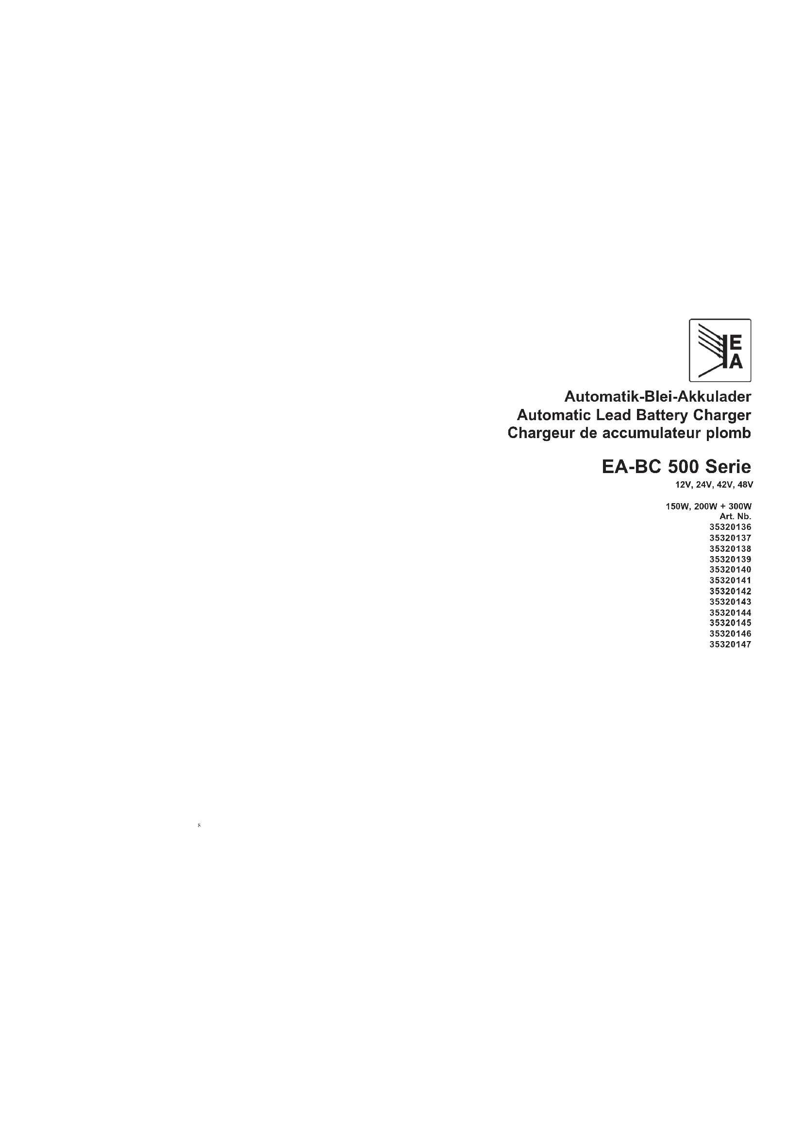Ces chargeurs automatiques peuvent charger des ac- cumulateurs au plomb. Sur l'avant des appareils, la charge des batteries à charger est indiquée. Pour pratique vide la batterie briller le LED dans rouge la couleur, avec plein Batterie briller celui LED vert. Entre celui LED brille orange. Le accumulateur à char- ger est attaché sur le câble de tiroir fourni à la platine avant. Tenez compte une température de la polarisa- tion correcte (= plus rouges +, noir = minus –) et échap- pements performance orienté veillez au refroidisse- ment de l'appareil. Volume de livraison: Chargeur EA-BC 500 y compris des câbles secteurs avec des prises de courant, des câbles de tiroir et des instructions d'emploi. Fonctions L'aération l'appareil est équipée avec un échappement. Il faut considérer que la convection aérienne n'est pas handicapée. Une distance de 5 cm à des objets voi- sins doit être observée. L'échappement commence, aussitôt que l'appareil se réchauffe dans l'entreprise. Entrée Le réseau l'appareil est attaché sur les environ 900mm longs câbles secteurs (3 x 0,75 mm