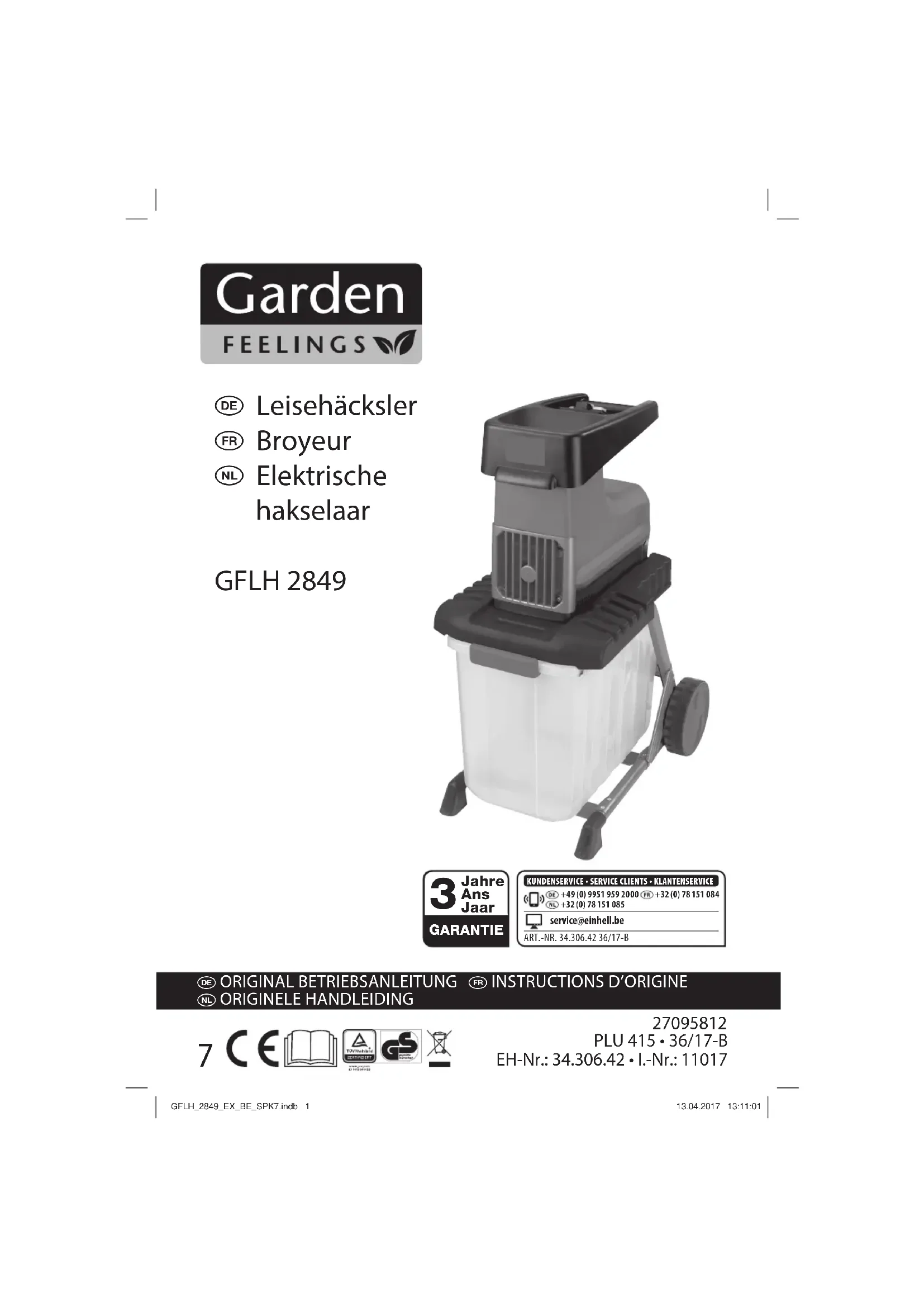 Nous fournissons une garantie de 3 ans pour l’appareil décrit dans le mode d’emploi, en cas de vice de notre produit. Le délai de 3 ans commence avec la transmission du risque ou la prise en charge de l’appareil par le client. La condition de base pour le faire valoir de la garantie est un entretien en bonne et due forme, conformément au mode d’emploi, tout comme une utilisation de notre appareil selon l’application prévue. Vous conservez bien entendu les droits de garantie légaux pendant ces 3 ans. La garantie est valable pour l’ensemble de la République Fédérale d’Allemagne ou des pays respectifs du partenaire commercial principal en complément des prescriptions légales locales. Veuillez noter l’interlocuteur du service après-vente compétent pour votre région ou l’adresse mentionnée ci-dessous. ISC (International Service Center) Eschenstrasse 6 94405 Landau/Isar, Duitsland Tel. Deutschsprachig: +49 (0)9951 959 2000 Tel. Nederlandstalig: +32 (0)78 151 085 Tel. Francophone: +32 (0) 78 151 084 MAIL: service@einhell.be GFLH_2849_EX_BE_SPK7.indb 48GFLH_2849_EX_BE_SPK7.indb 48 13.04.2017 13:11:1113.04.2017 13:11:11N