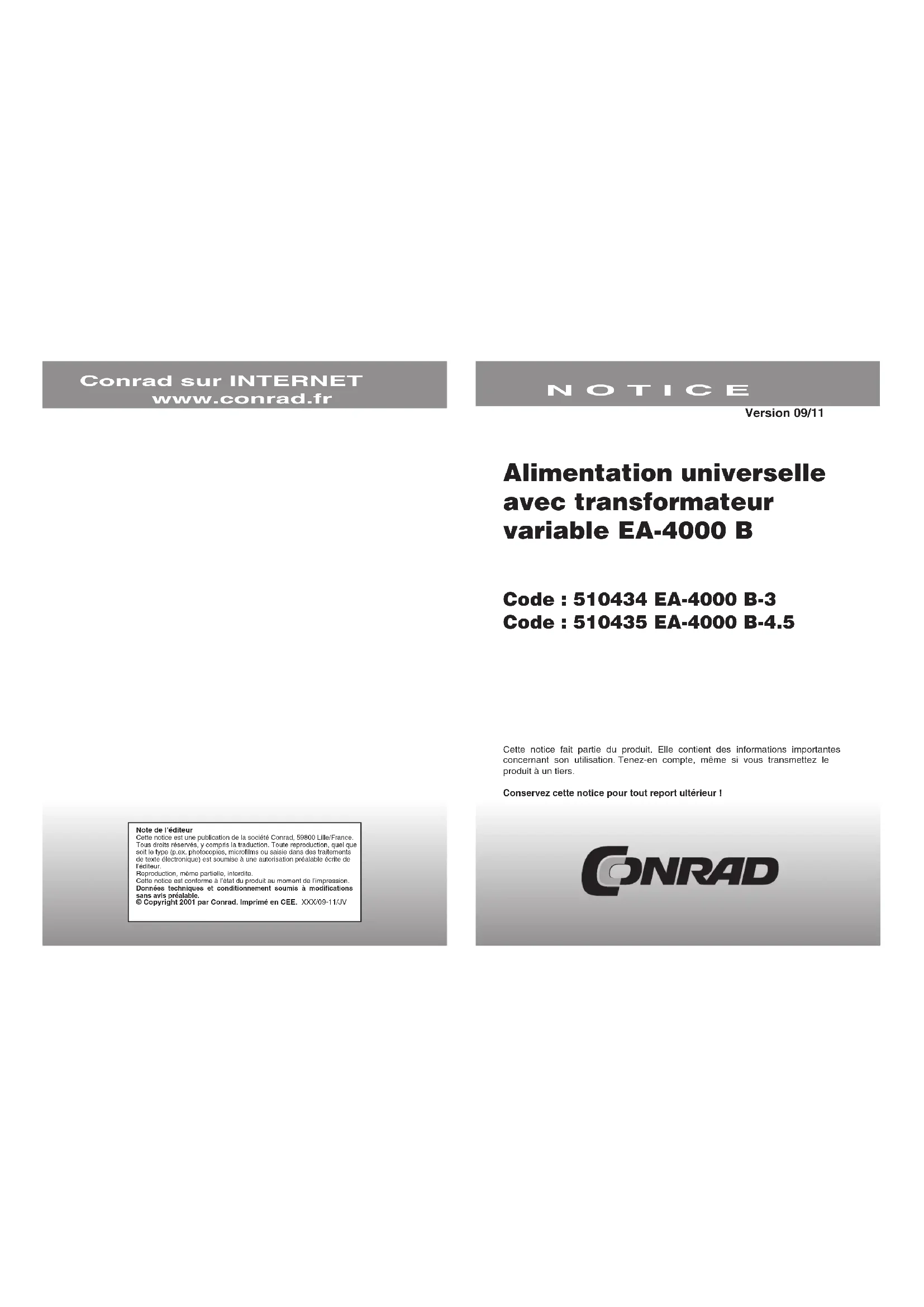 - Note de l’éditeurCette notice est une publication de la société Conrad, 59800 Lille/France.Tous droits réservés, y compris la traduction. Toute reproduction, quel que soit le type (p.ex. photocopies, microfilms ou saisie dans des traitements de texte électronique) est soumise à une autorisation préalable écrite de l’éditeur.Reproduction, même partielle, interdite.Cette notice est conforme à l’état du produit au moment de l’impression.Données techniques et conditionnement soumis à modifications sans avis préalable.© Copyright 2001 par Conrad. Imprimé en CEE. XXX/09-11/JV Alimentation universelle avec transformateur variable EA-4000 B Code : 510434 EA-4000 B-3 Code : 510435 EA-4000 B-4.5 Cette notice fait partie du produit. Elle contient des informations importantes concernant son utilisation. Tenez-en compte, même si vous transmettez le produit à un tiers. Conservez cette notice pour tout report ultérieur ! N O T I C E Conrad sur INTERNET www.conrad.fr Version 09/11Avant de mettre en service de l’appareil, il convient de vérifier le boîtier, les éléments de commande, l’afficheur ainsi que le câble d’alimentation. Si vous constatez une détérioration, ne branchez en aucun cas l’appareil au secteur. Débranchez impérativement l’appareil du réseau électrique avant toute ouverture. L’entretien et la réparation ou la calibration de l’appareil sont strictement réservés au personnel qualifié. Cette alimentation doit être branchée uniquement sur une prise de terre 230 V 50 Hz du réseau domestique. Le fusible de secteur se trouve sur l’interrupteur réseau, à l’avant. Si un remplacement de fusible est nécessaire, utilisez seulement des fusibles du même type et de la même intensité. L’appareil doit être débranché du secteur pour cela. Les fentes d’aération de l’alimentation ne doivent pas être recouvertes ! Données techniques Tension du secteur 230 ±10% / 50/60 Hz Sortie 1 230V AC / 2A Sortie 2 0 p. 130