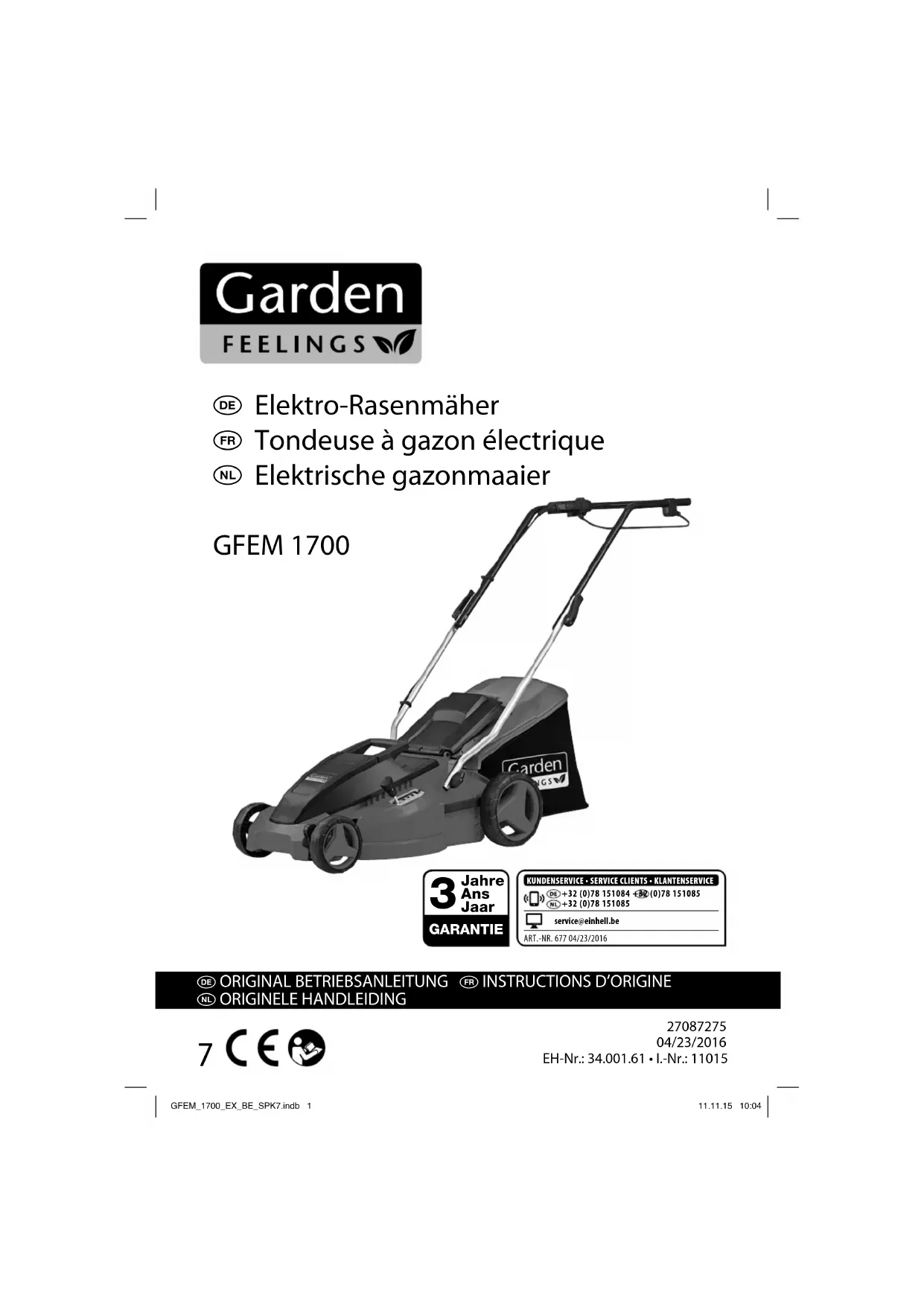 Nous fournissons une garantie de 3 ans pour l’appareil décrit dans le mode d’emploi, en cas de vice de notre produit. Le délai de 3 ans commence avec la transmission du risque ou la prise en charge de l’appareil par le client. La condition de base pour le faire valoir de la garantie est un entretien en bonne et due forme, conformément au mode d’emploi, tout comme une utilisation de notre appareil selon l’application prévue. Vous conservez bien entendu les droits de garantie légaux pendant ces 3 ans. La garantie est valable pour l’ensemble de la République Fédérale d’Allemagne ou des pays respectifs du partenaire commercial principal en complément des prescriptions légales locales. Veuillez noter l’interlocuteur du service après- vente compétent pour votre région ou l’adresse mentionnée ci-dessous. ISC (International Service Center) Eschenstrasse 6 94405 Landau/Isar, Duitsland Tel. Nederlandstalig: +32 (0)78 151 085 Tel. Francophone: +32 (0)78 151 084 MAIL: service@einhell.be GFEM_1700_EX_BE_SPK7.indb 39GFEM_1700_EX_BE_SPK7.indb 39 11.11.15 10:0411.11.15 10:04N