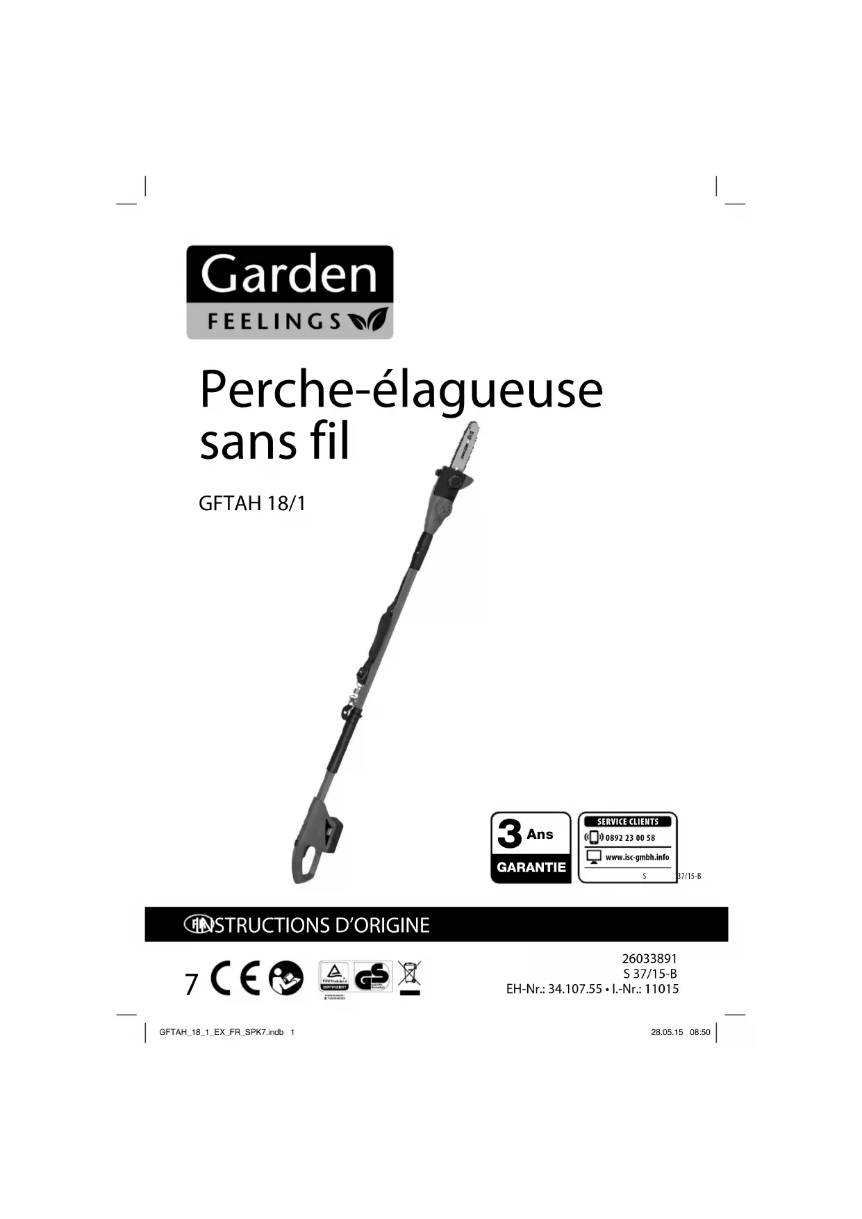 après-vente sans payer le port. Si le défaut est couvert par la garantie, vous recevrez l’appareil réparé ou un nouvel appareil. Ceci est également valable pour les réparations à domicile. Veuillez noter que notre garantie n’est plus valable en cas de défaut d’utilisation, de non suivi des mesures de sécuri- té, si le produit a subi des chocs ou a fait l’objet d’une réparation par un S.A.V non mentionné sur la carte de garantie. Dans le cas d’un défaut non garanti, les frais de réparations seront à votre charge. Il est néanmoins possible de s’adresser au S.A.V mentionné. Einhell France Paris Nord 2 33, rue des Vanesses BP-59018 Villepinte 95945 Roissy Ch. de Gaulle Cedex Tel. 0892 23 00 58 • Fax +33 1 48 63 27 72 GFTAH_18_1_EX_FR_SPK7.indb 29GFTAH_18_1_EX_FR_SPK7.indb 29 28.05.15 08:5028.05.15 08:50Gao/Product-ManagementWeichselgartner/General-Manager
