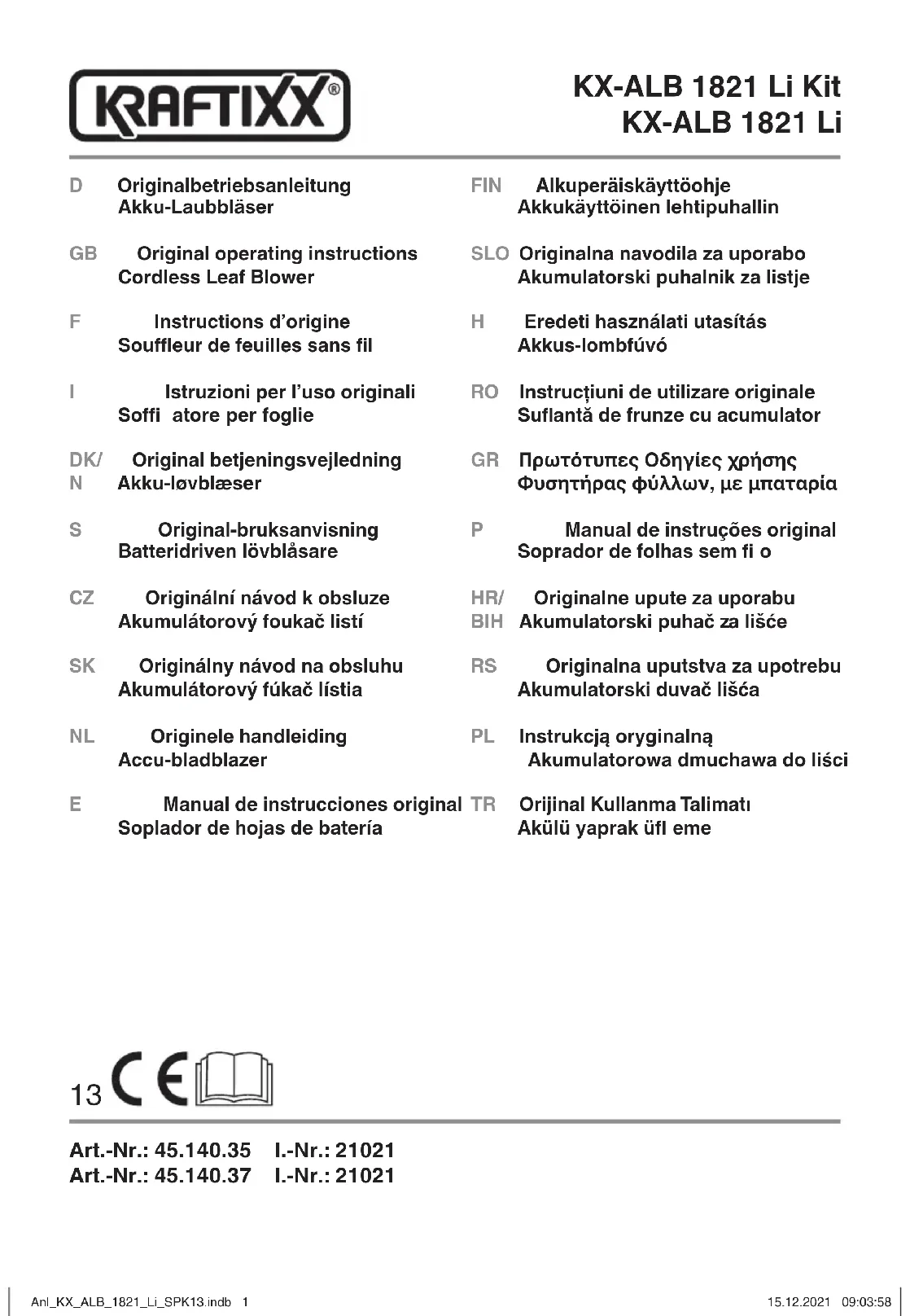 KX-ALB 1821 Li - Souffleur Kraftixx - Notice d'utilisation et mode d'emploi gratuit