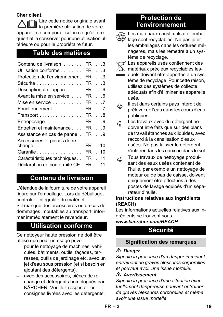 Contenu de livraison L'étendue de la fourniture de votre appareil figure sur l'emballage. Lors du déballage, contrôler l’intégralité du matériel. S'il manque des accessoires ou en cas de dommages imputables au transport, informer immédiatement le revendeur. Utilisation conforme Ce nettoyeur haute pression ne doit être utilisé que pour un usage privé: – pour le nettoyage de machines, véhicules, bâtiments, outils, façades, terrasses, outils de jardinage etc. avec un jet d'eau sous pression (et si besoin en ajoutant des détergents). – avec des accessoires, pièces de rechange et détergents homologués par KÄRCHER. Veuillez respecter les consignes livrées avec les détergents. Protection de l’environnement Les matériaux constitutifs de l’emballage sont recyclables. Ne pas jeter les emballages dans les ordures ménagères, mais les remettre à un système de recyclage. Les appareils usés contiennent des matériaux précieux recyclables lesquels doivent être apportés à un système de recyclage. Pour cette raison, utilisez des systèmes de collecte adéquats afin d'éliminer les appareils usés. Il est dans certains pays interdit de prélever de l'eau dans les cours d'eau publiques. Les travaux avec du détergent ne doivent être faits que sur des plans de travail étanches aux liquides, avec raccord à la canalisation d'eaux usées. Ne pas laisser le détergent s'infiltrer dans les eaux ou dans le sol. Tous travaux de nettoyage produisant des eaux usées contenant de l’huile, par exemple un nettoyage de moteur ou de bas de caisse, doivent uniquement être effectués à des postes de lavage équipés d’un séparateur d’huile. Instructions relatives aux ingrédients (REACH) Les informations actuelles relatives aux ingrédients se trouvent sous : www.kaercher.com/REACH Sécurité Signification des remarques Danger Signale la présence d'un danger imminent entraînant de graves blessures corporelles et pouvant avoir une issue mortelle. 몇 Avertissement Signale la présence d'une situation éventuellement dangereuse pouvant entraîner de graves blessures corporelles et même avoir une issue mortelle. FR – 3