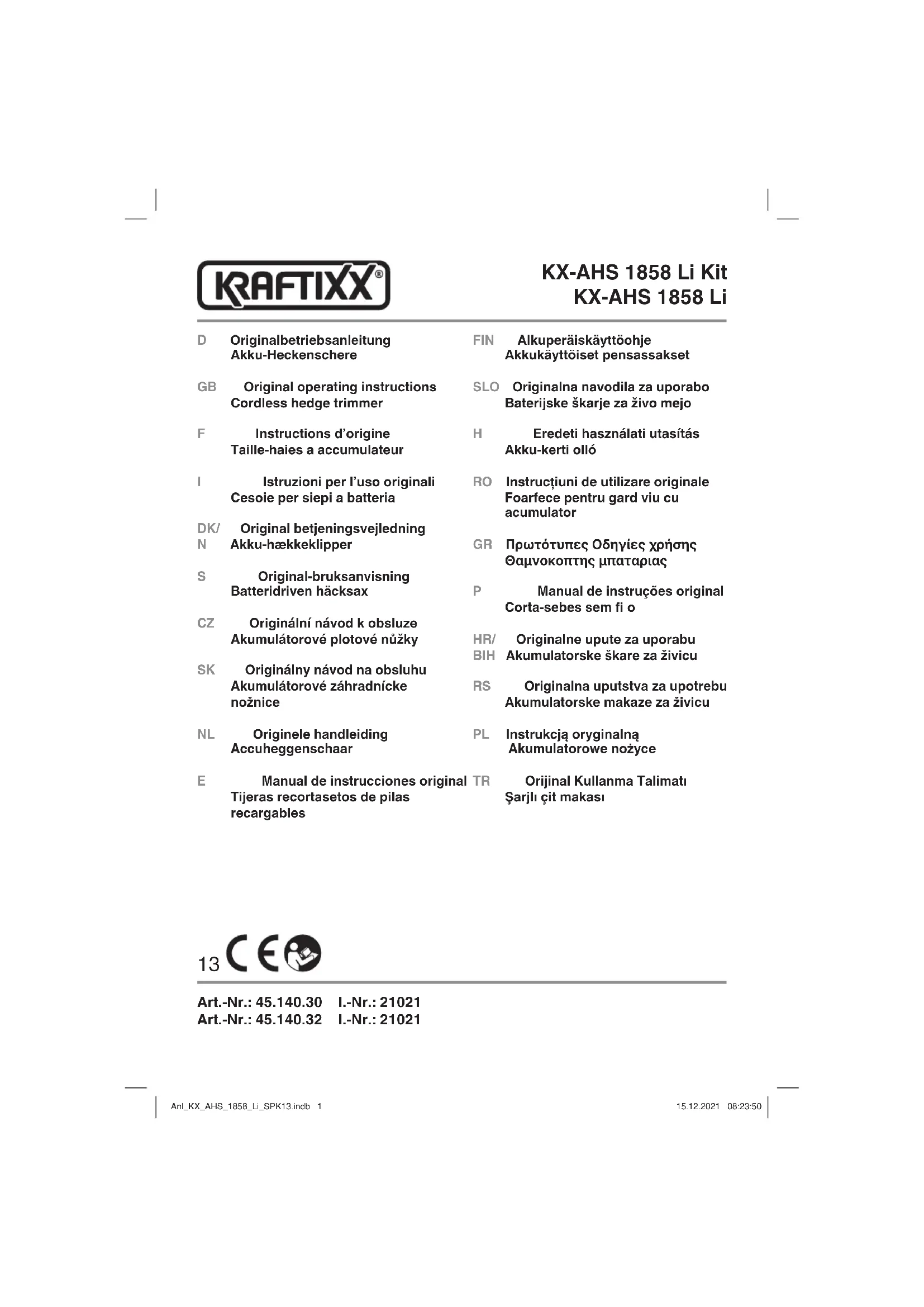 Uniquement pour les pays de l’Union Européenne Ne jetez pas les outils électriques dans les ordures ménagères! Selon la norme européenne 2012/19/CE relative aux appareils électriques et systèmes électroniques usés et selon son application dans le droit national, les outils électriques usés doivent être récoltés à part et apportés à un recyclage respectueux de l’environnement. Possibilité de recyclage en alternative à la demande de renvoi : Le propriétaire de l’appareil électrique est obligé, en guise d’alternative à un envoi en retour, à contribu- er à un recyclage eff ectué dans les règles de l’art en cas de cessation de la propriété. L’ancien appareil peut être remis à un point de collecte dans ce but. Cet organisme devra l’éliminer dans le sens de la Loi sur le cycle des matières et les déchets. Ne sont pas concernés les accessoires et ressources fournies sans composants électroniques. Toute réimpression ou autre reproduction de la documentation et des papiers joints aux produits, même sous forme d’extraits, est uniquement permise une fois l’accord explicite de l’ISC GmbH obtenu. Sous réserve de modifi cations techniques Anl_KX_AHS_1858_Li_SPK13.indb 31Anl_KX_AHS_1858_Li_SPK13.indb 31 15.12.2021 08:26:1715.12.2021 08:26:17F