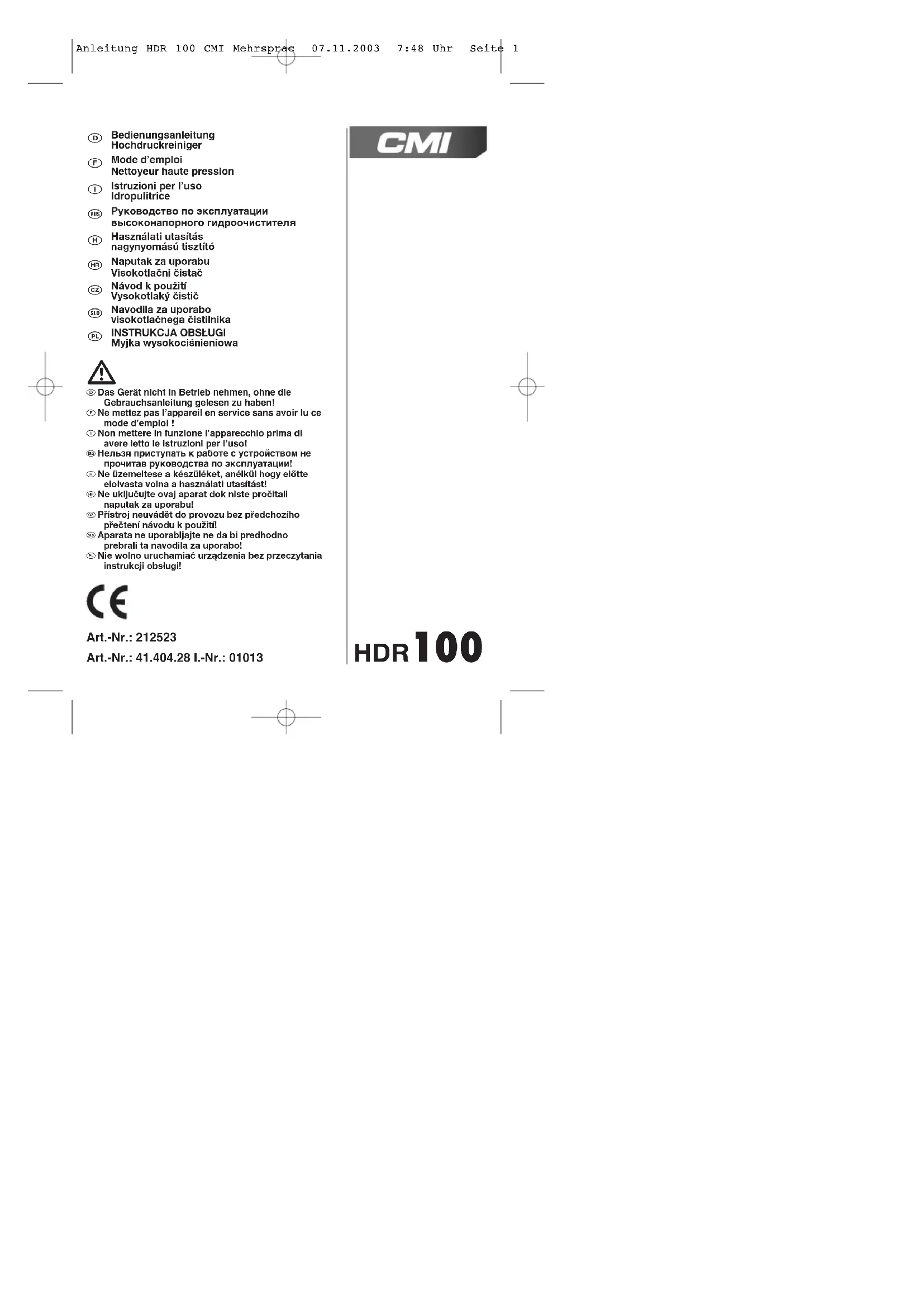 Téléchargez la notice de votre Nettoyeur haute pressio au format PDF gratuitement ! Retrouvez votre notice HDR 100 - CMI et reprennez votre appareil électronique en main. Sur cette page sont publiés tous les documents nécessaires à l'utilisation de votre appareil HDR 100 de la marque CMI.