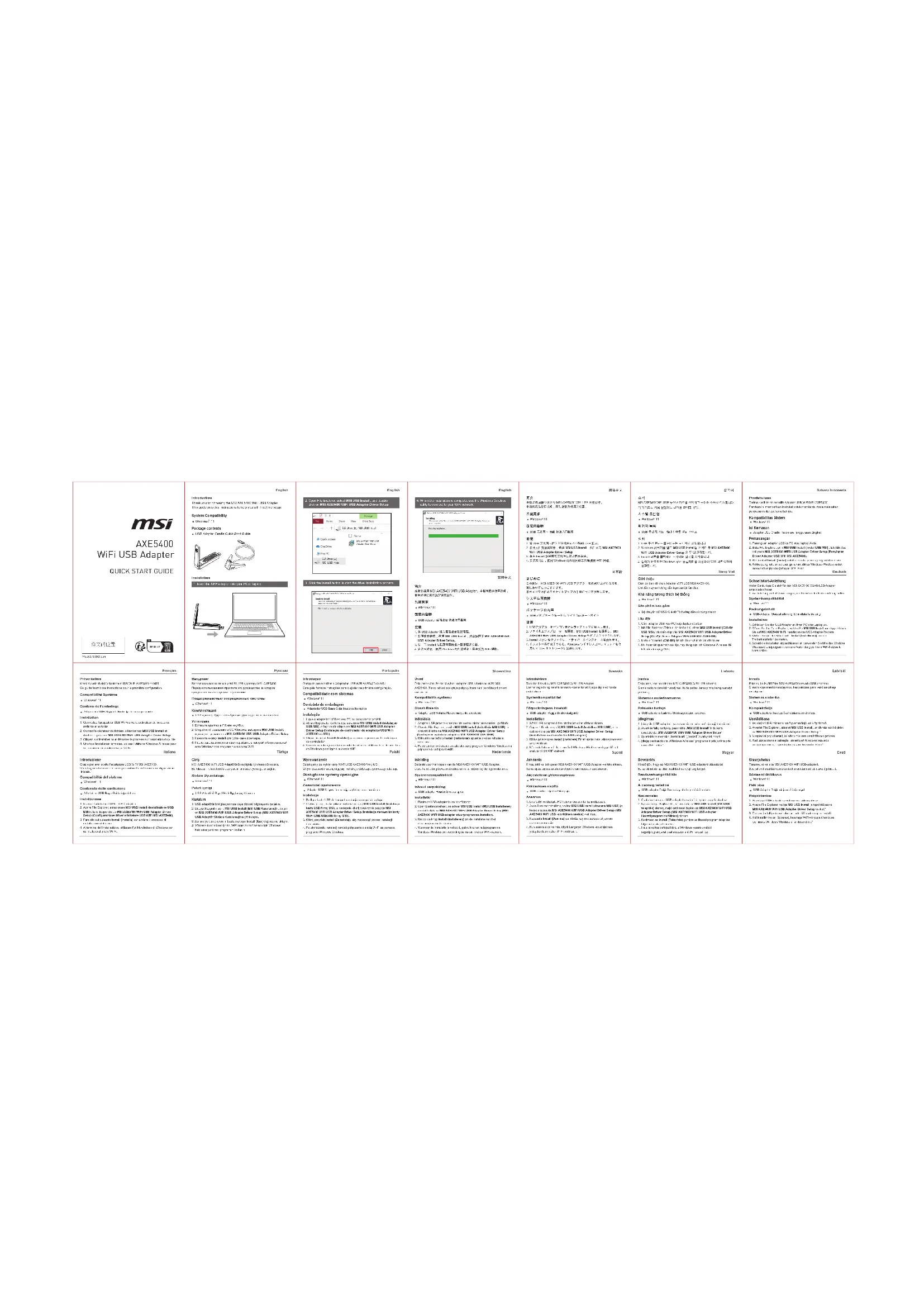 USB Adaptörü Stand Hızlı Başlangıç Kılavuzu Installation Présentation Merci d’avoir choisi l’adaptateur USB Wi-Fi AXE5400 de MSI. Ce guide fournit des instructions pour la première configuration.
