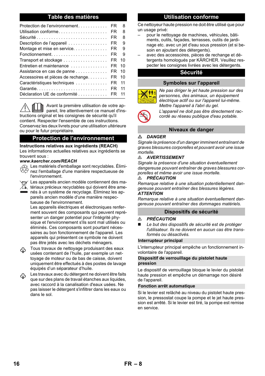Table des matières Protection de l’environnement... Utilisation conforme... Sécurité ... Description de l’appareil ... Montage et mise en service... Fonctionnement... Transport et stockage ... Entretien et maintenance ... Assistance en cas de panne ... Accessoires et pièces de rechange... Caractéristiques techniques ... Garantie... Déclaration UE de conformité ... Ce nettoyeur haute pression ne doit être utilisé que pour un usage privé: – pour le nettoyage de machines, véhicules, bâtiments, outils, façades, terrasses, outils de jardinage etc. avec un jet d'eau sous pression (et si besoin en ajoutant des détergents). – avec des accessoires, pièces de rechange et détergents homologués par KÄRCHER. Veuillez respecter les consignes livrées avec les détergents. Sécurité Symboles sur l'appareil Ne pas diriger le jet haute pression sur des personnes, des animaux, un équipement électrique actif ou sur l'appareil lui-même. Mettre l'appareil à l'abri du gel. L'appareil ne doit pas être directement raccordé au réseau publique d'eau potable. Avant la première utilisation de votre appareil, lire attentivement ce manuel d'instructions original et les consignes de sécurité qu'il contient. Respecter l'ensemble de ces instructions. Conservez les deux livrets pour une utilisation ultérieure ou pour le futur propriétaire. Protection de l’environnement Instructions relatives aux ingrédients (REACH) Les informations actuelles relatives aux ingrédients se trouvent sous : www.kaercher.com/REACH Les matériels d'emballage sont recyclables. Éliminez l'emballage d'une manière respectueuse de l'environnement. Les appareils ancien modèle contiennent des matériaux précieux recyclables qui doivent être amenés à un système de recyclage. Éliminez les appareils ancien modèle d'une manière respectueuse de l'environnement. Les appareils électriques et électroniques renferment souvent des composants qui peuvent représenter un danger potentiel pour l'intégrité physique et l'environnement s'ils sont mal utilisés ou éliminés. Ces composants sont pourtant nécessaires au bon fonctionnement de l'appareil. Les appareils qui présentent ce symbole ne doivent pas être jetés avec les déchets ménagers. Tous travaux de nettoyage produisant des eaux usées contenant de l’huile, par exemple un nettoyage de moteur ou de bas de caisse, doivent uniquement être effectués à des postes de lavage équipés d’un séparateur d’huile. Les travaux avec du détergent ne doivent être faits que sur des plans de travail étanches aux liquides, avec raccord à la canalisation d'eaux usées. Ne pas laisser le détergent s'infiltrer dans les eaux ou dans le sol.