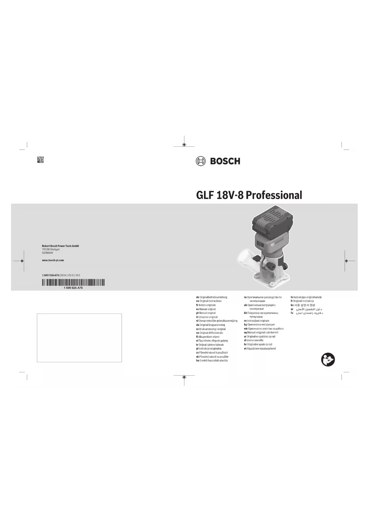pour le stockage °C –20...+50 Batteries recommandées GBA 18V… ProCORE18V… 1 609 92A A76 | (10.10.2024) Bosch Power ToolsFrançais | 25 Affleureuse GLF 18V-8 Chargeurs recommandés GAL 18… GAX 18… GAL 36…