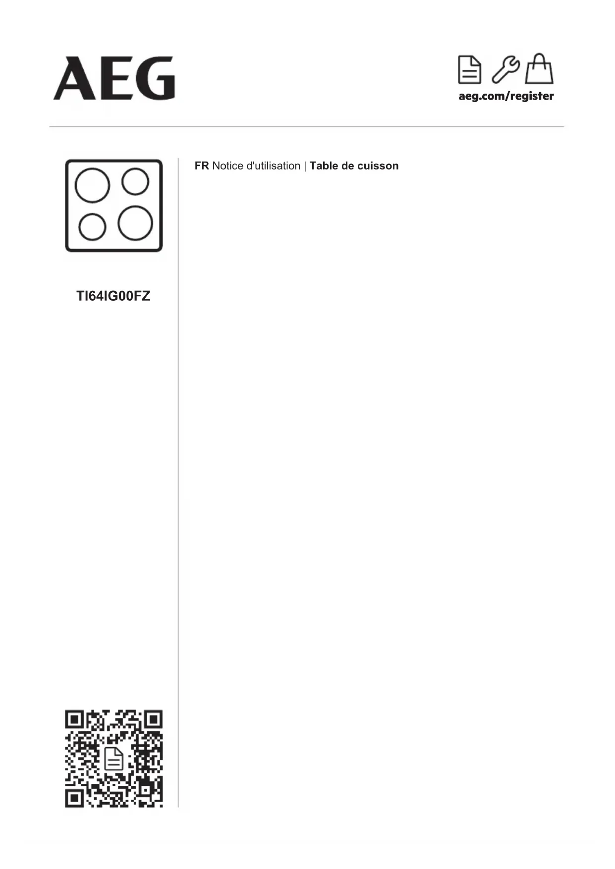 aeg.com/register TI64IG00FZ FR Notice d'utilisation | Table de cuisson aeg.com\registerBienvenue chez AEG ! Nous vous remercions d’avoir choisi l’un de nos appareils. Obtenir des conseils d’utilisation, des brochures, un dépanneur, des informations surle service et les réparations :www.aeg.com/supportSous réserve de modifications.