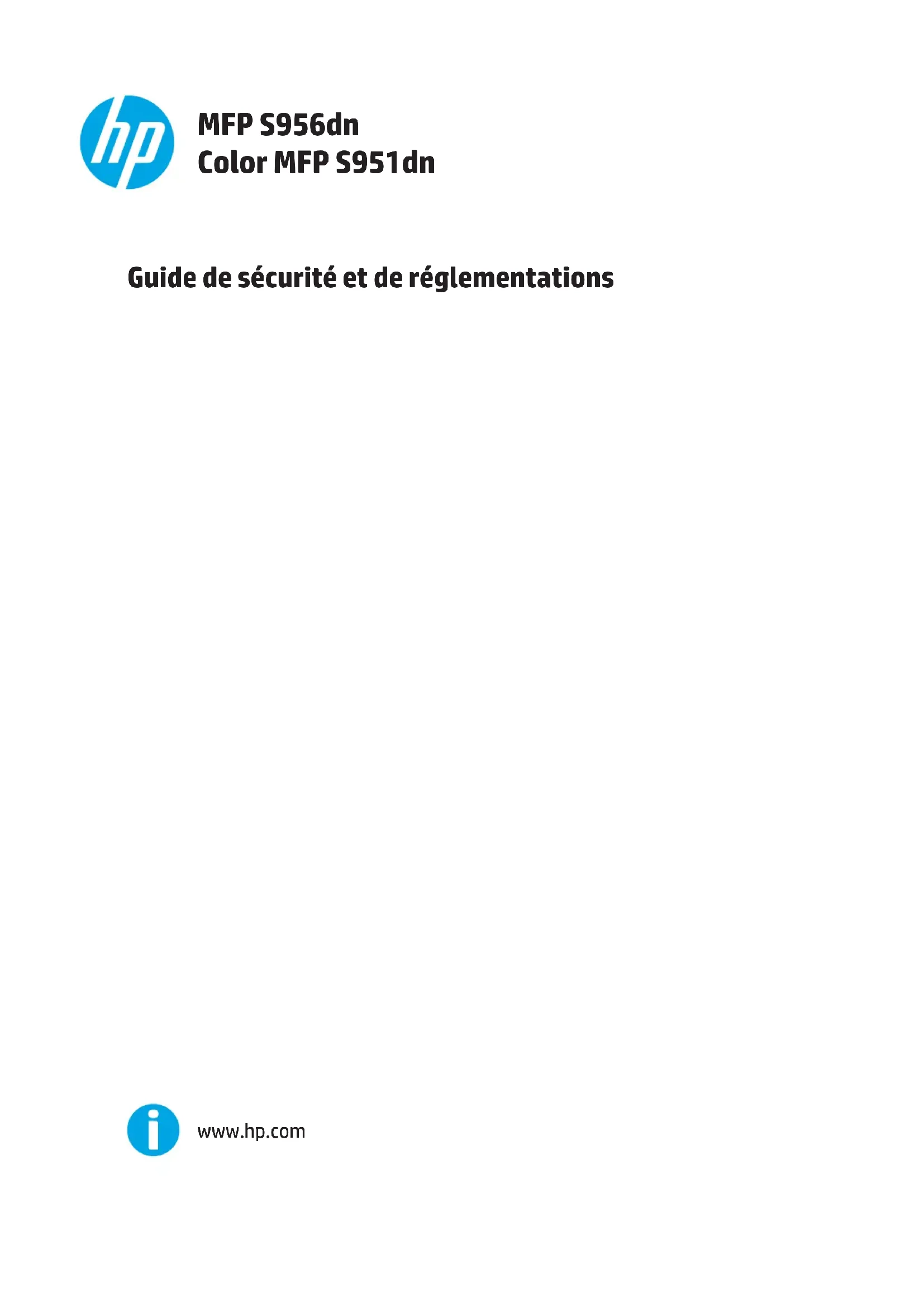Guide de sécurité et de réglementations MFP S956dn Color MFP S951dn www.hp.comHP MFP S956dn, HP Color MFP S951dn Guide de sécurité et de réglementationsCopyright et licence © Copyright 2016 HP Development Company, L.P. Il est interdit de reproduire, adapter ou traduire ce manuel sans autorisation expresse par écrit, sauf dans les cas permis par les lois régissant les droits d'auteur. Les informations contenues dans ce document sont susceptibles d'être modiées sans préavis. Les seules garanties des produits et services HP sont exposées dans les clauses expresses de garantie fournies avec les produits ou services concernés. Le contenu de ce document ne constitue en aucun cas une garantie supplémentaire. HP ne peut être tenu responsable des éventuelles erreurs techniques ou éditoriales de ce document. Edition 1, 2/2016 Marques commerciales ENERGY STAR