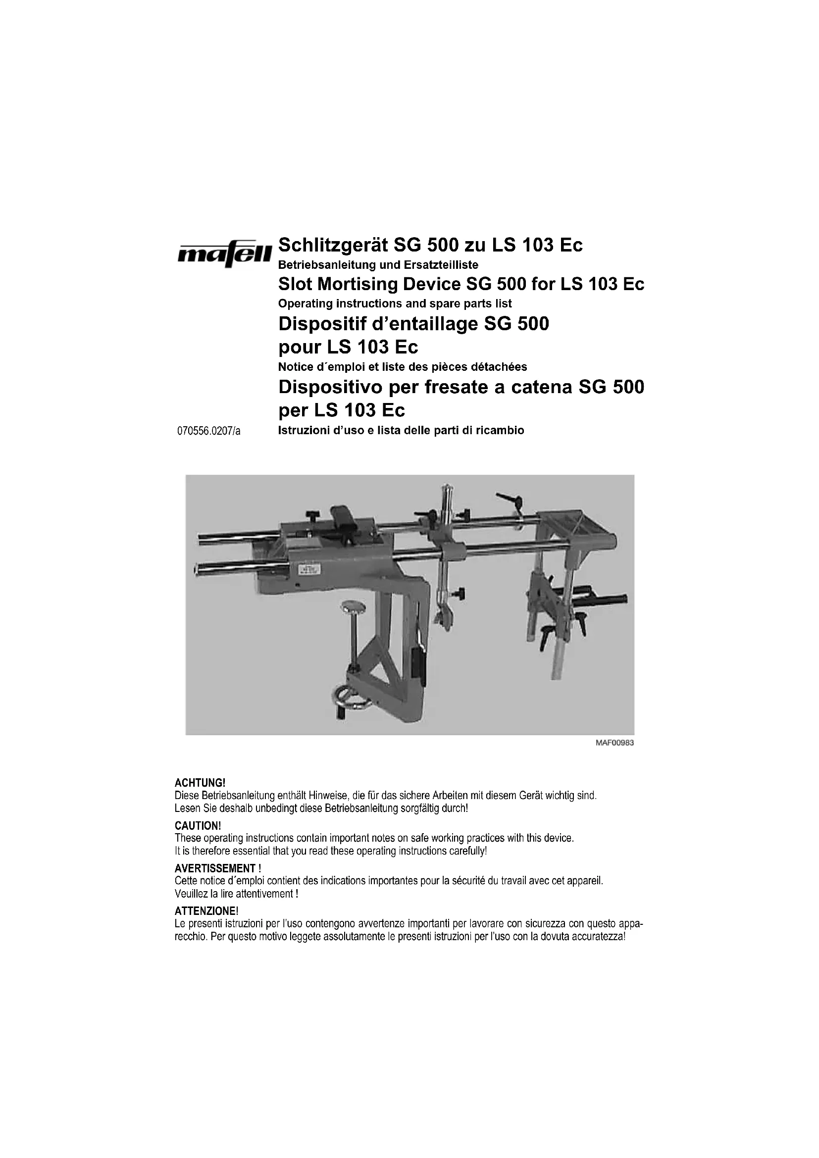 ment latéral Les côtés intérieurs du support à serrer doivent se coller contre la pièce à travailler. Serrer le dispositif d’entaillage entier à l’aide de la manivelle. Pour déplacer le dispositif d’entaillage latéralement pour effectuer des entailles plus longues, il suffit de des- serrer levier excentrique 20 et de le resserrer après le déplacement. 5 Maintenance Utiliser la pompe de graissage pour graisser réguliè- rement le palier à rouleaux du guide de chaîne par le trou prévu à cet effet (utiliser uniquement de la graisse pour roulement à billes non acide) ! Après chaque affûtage, tremper la chaîne à mortai- ser dans un bain d’huile. En utilisation intense, lubri- fier la chaîne plusieurs fois par jour ! Avant de re-tendre la chaîne laisser la refroidir. Pour des longueurs d’entaille de plus de 50 mm, entailler d’abord sur le tracé droit, retirer la machine et faire un autre entaillage vers la gauche selon la lon- gueur d’entaille. Les machines MAFELL sont conçues pour fonctionner avec très peu d´entre- tien. Après une longue période d’utilisa- tion, une révision de la machine par un atelier service après-vente agréé MAFELL est recommandée.-11- Questo apparecchio serve da dispositivo addizionale per la mortasatrice a catena LS 103 Ec per la lavorazione del legno. Un utilizzo non conforme allo scopo d'impiego previsto può causare incidenti. 1 Informazioni di prodotto per il dispositivo per fresate a catena SG 500 con n° art. 201005