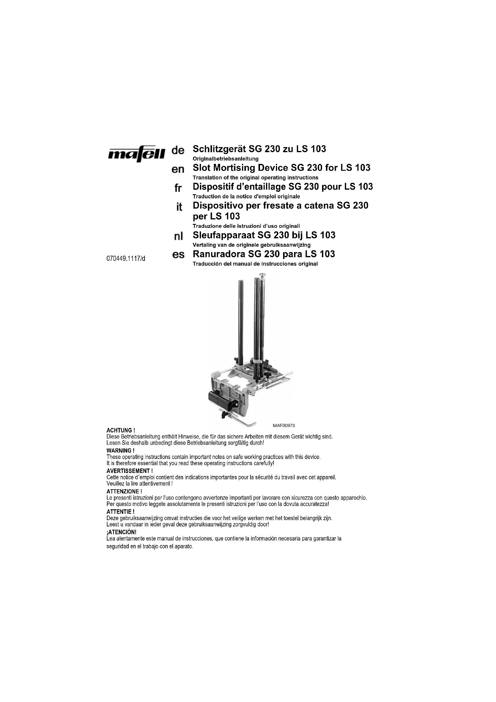 ment latéral Lors du mortaisage vertical la pointe de positionne- ment 11 (ill. 1) sert comme dispositif protecteur con- tre le déplacement. La pointe de positionnement se fixe par vissage. 5 Maintenance Utiliser la pompe de graissage 15 (ill. 2) pour grais- ser régulièrement le palier à rouleaux du guide de chaîne par le trou prévu à cet effet (utiliser unique- ment de la graisse pour roulement à billes non acide) ! Après chaque affûtage, tremper la chaîne à mortai- ser dans un bain d’huile. En utilisation intense, lubri- fier la chaîne plusieurs fois par jour ! Avant de re-tendre la chaîne laisser la refroidir. 6 Schéma éclaté et liste de pièces de rechange Les informations correspondantes, relatives aux pièces de rechange, se trouvent sur notre page web : www.mafell.com Pour des longueurs d’entaille de plus de 50 mm, entailler d’abord sur le tracé droit, retirer la machine et faire un autre entaillage vers la gauche selon la lon- gueur d’entaille.-9- Questo apparecchio serve da dispositivo addizionale per la mortasatrice a catena LS 103 per la lavorazione del legno. Un utilizzo non conforme allo scopo d'impiego previsto può causare incidenti. 1 Informazioni di prodotto per il dispositivo per fresate a catena SG 230 con n° art. 200990