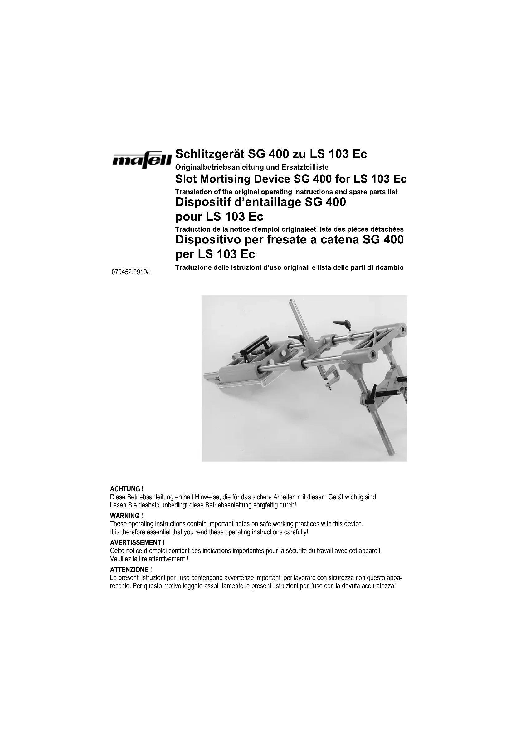 ment latéral Démonter les pointes de positionnement 20 (ill. 3) du plateau pivotant et les monter dans les trous file- tés 21 de la butée. Régler la plaque de base suivant l’échelle 22 et la presser fortement contre le bois. 5 Maintenance Utiliser la pompe de graissage pour graisser régu- lièrement le palier à rouleaux du guide de chaîne par le trou prévu à cet effet (utiliser uniquement de la graisse pour roulement à billes non acide) ! Après chaque affûtage, tremper la chaîne à mortai- ser dans un bain d’huile. En utilisation intense, lubri- fier la chaîne plusieurs fois par jour ! Avant de re-tendre la chaîne laisser la refroidir. Pour des longueurs d’entaille de plus de 50 mm, entailler d’abord sur le tracé droit, retirer la machine et faire un autre entaillage vers la gauche selon la lon- gueur d’entaille. Les machines MAFELL sont conçues pour fonctionner avec très peu d´entre- tien. Après une longue période d’utilisa- tion, une révision de la machine par un atelier service après-vente agréé MAFELL est recommandée.-11- Questo apparecchio serve da dispositivo addizionale per la mortasatrice a catena LS 103 Ec per la lavorazione del legno. Un utilizzo non conforme allo scopo d'impiego previsto può causare incidenti. 1 Informazioni di prodotto per il dispositivo per fresate a catena SG 400 con n° art. 201000