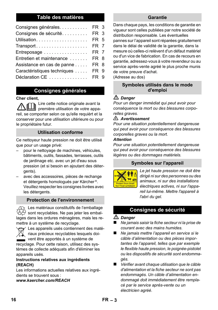 Table des matières Consignes générales... Consignes de sécurité... Utilisation... Transport ... Entreposage ... Entretien et maintenance ... Assistance en cas de panne ... Caractéristiques techniques ... Déclaration CE ... Dans chaque pays, les conditions de garantie en vigueur sont celles publiées par notre société de distribution responsable. Les éventuelles pannes sur l’appareil sont réparées gratuitement dans le délai de validité de la garantie, dans la mesure où celles-ci relèvent d'un défaut matériel ou d'un vice de fabrication. En cas de recours en garantie, adressez-vous à votre revendeur ou au service après-vente agréé le plus proche munis de votre preuve d'achat. (Adresse au dos) Symboles utilisés dans le mode d'emploi Consignes générales Cher client, Lire cette notice originale avant la première utilisation de votre appareil, se comporter selon ce qu'elle requièrt et la conserver pour une utilisation ultérieure ou pour le propriétaire futur. Utilisation conforme Ce nettoyeur haute pression ne doit être utilisé que pour un usage privé: – pour le nettoyage de machines, véhicules, bâtiments, outils, fassades, terrasses, outils de jardinage etc. avec un jet d'eau sous pression (et si besoin en ajoutant des détergents). – avec des accessoires, pièces de rechange et détergents homologués par Kärcher ®. Veuillez respecter les consignes livrées avec les détergents. Danger Pour un danger immédiat qui peut avoir pour conséquence la mort ou des blessures corporelles graves. 몇 Avertissement Pour une situation potentiellement dangereuse qui peut avoir pour conséquence des blessures corporelles graves ou la mort. Attention Pour une situation potentiellement dangereuse qui peut avoir pour conséquence des blessures légères ou des dommages matériels. Symboles sur l'appareil Le jet haute pression ne doit être dirigé ni sur des personnes ou des animaux, ni sur des installations électriques actives, ni sur l'appareil lui-même. Mettre l'appareil à l'abri du gel. Protection de l’environnement Les matériaux constitutifs de l’emballage sont recyclables. Ne pas jeter les emballages dans les ordures ménagères, mais les remettre à un système de recyclage. Les appareils usés contiennent des matériaux précieux recyclables lesquels doivent être apportés à un système de recyclage. Pour cette raison, utilisez des systèmes de collecte adéquats afin d'éliminer les appareils usés. Instructions relatives aux ingrédients (REACH) Les informations actuelles relatives aux ingrédients se trouvent sous : www.kaercher.com/REACH