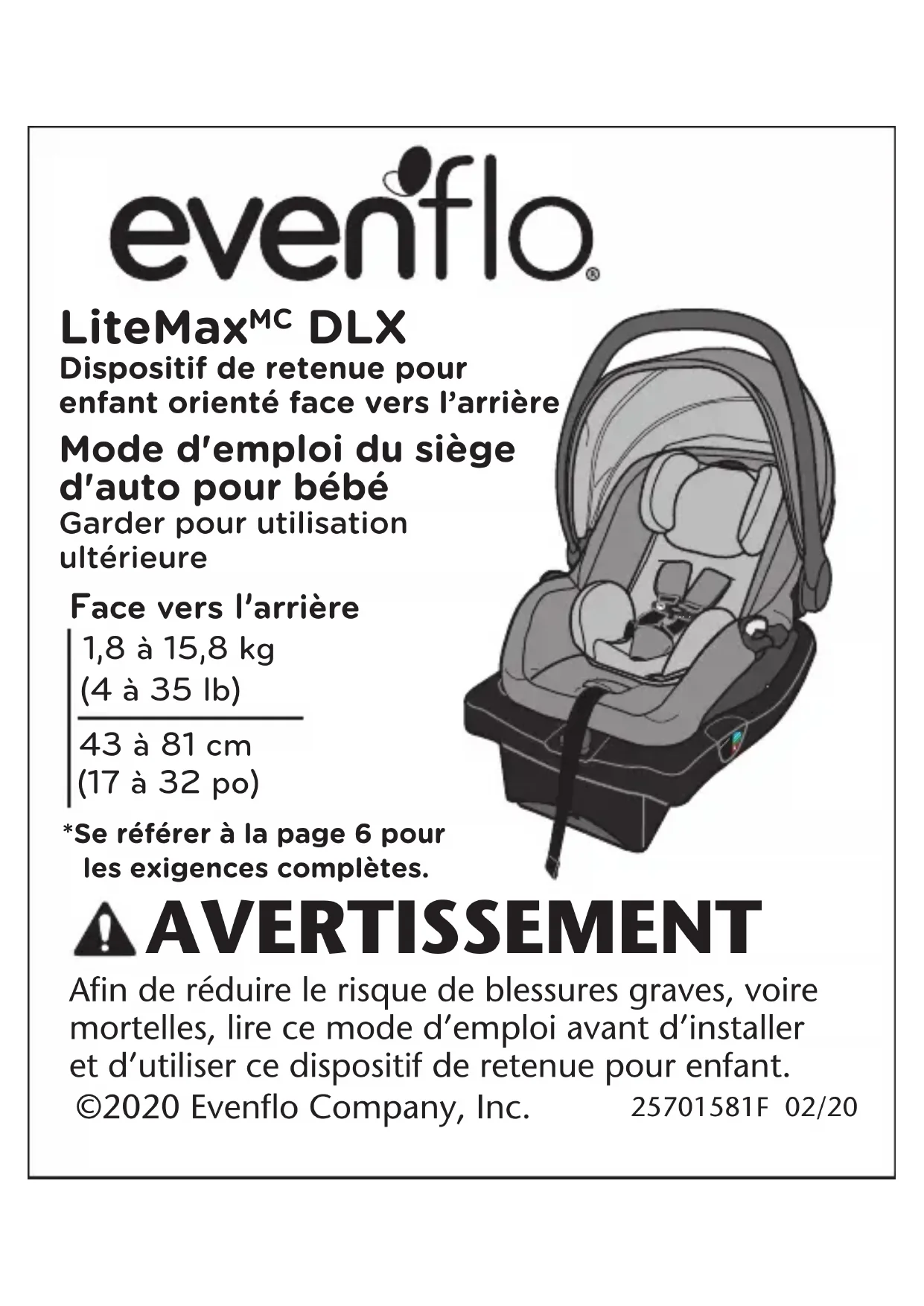 Face vers l’arrière 1,8 à 15,8 kg (4 à 35 lb) 43 à 81 cm (17 à 32 po) ©2020 Evenflo Company, Inc. 25701581F 02/20 AVERTISSEMENT Afin de réduire le risque de blessures graves, voire mortelles, lire ce mode d’emploi avant d’installer et d’utiliser ce dispositif de retenue pour enfant.2 Plus d’enfants, passagers d’un véhicule, sont tués chaque année dans des collisions automobiles que par tout autre type de blessures. Pour réduire le risque de BLESSURES GRAVES, voire MORTELLES, lire ce mode d’emploi et le manuel du propriétaire du véhicule avant d’installer et d’utiliser ce dispositif de retenue pour enfant. L’utilisation d’un dispositif de retenue pour enfant fait une grande différence. En utilisant correctement ce dispositif de retenue pour enfant et en suivant ces instructions (et les instructions jointes à votre véhicule), vous réduirez considérablement les risques de blessures graves, voire mortelles, de votre enfant suite à une collision. Ne vous laissez pas induire en erreur par le terme courant « siège de sécurité »; aucun dispositif de retenue ne peut empêcher toutes les blessures dans toutes les collisions. Nombre d’adultes et d’enfants correctement maintenus subissent des blessures dans des collisions automobiles, même dans des collisions relativement mineures. Un dispositif de retenue pour enfant correctement attaché est le meilleur moyen de réduire au maximum les blessures de l’enfant et d’augmenter ses chances de survie dans la plupart des collisions automobiles.3 Avis réglementaire des É.-U. Ce dispositif de retenue pour enfant est conforme à toutes les exigences de la norme fédérale 213 régissant la sécurité des véhicules automobiles. Concernant les modèles canadiens