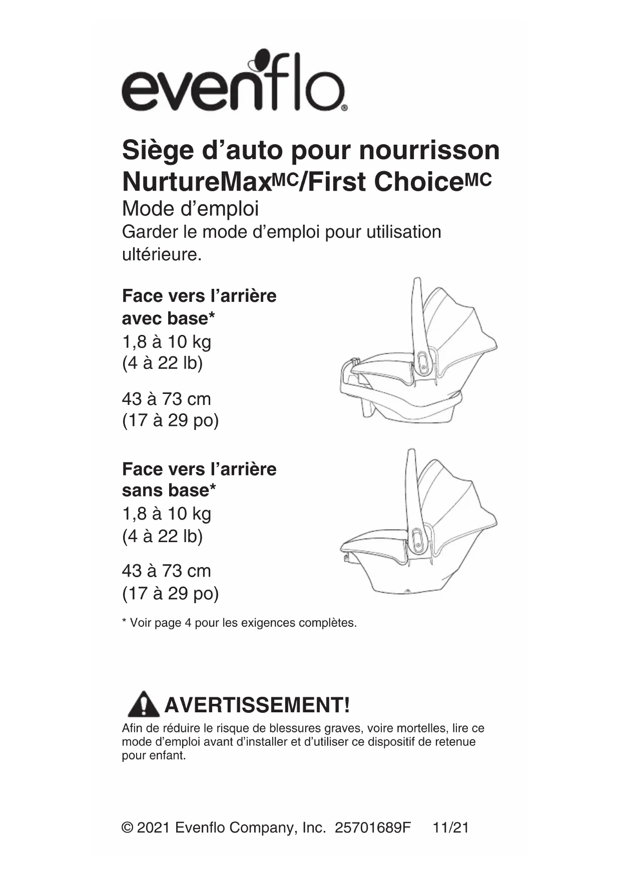 An de réduire le risque de blessures graves, voire mortelles, lire ce mode d’emploi avant d’installer et d’utiliser ce dispositif de retenue pour enfant. AVERTISSEMENT! © 2021 Eveno Company, Inc. 25701689F 11/21 Face vers l’arrière avec base* 1,8 à 10kg (4 à 22 lb) 43 à 73 cm (17 à 29 po) *Voir page 4 pour les exigences complètes. Siège d’auto pour nourrisson NurtureMax