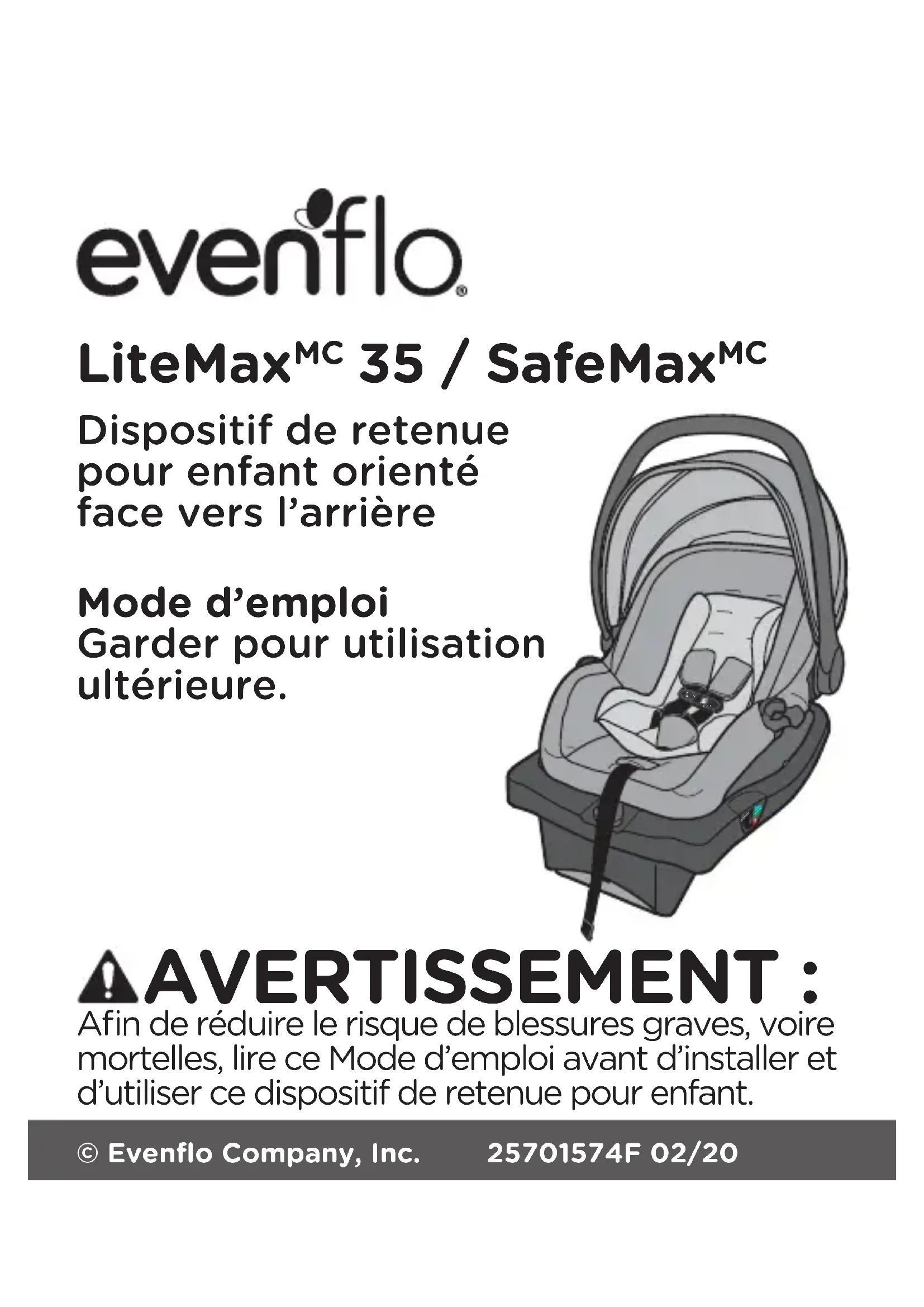 © Evenflo Company, Inc. 25701574F 02/20LiteMax 35 / SafeMax Dispositif de retenue pour enfant orienté face vers l’arrièreMode d’emploiGarder pour utilisation ultérieure. Afin de réduire le risque de blessures graves, voire mortelles, lire ce Mode d’emploi avant d’installer et d’utiliser ce dispositif de retenue pour enfant.