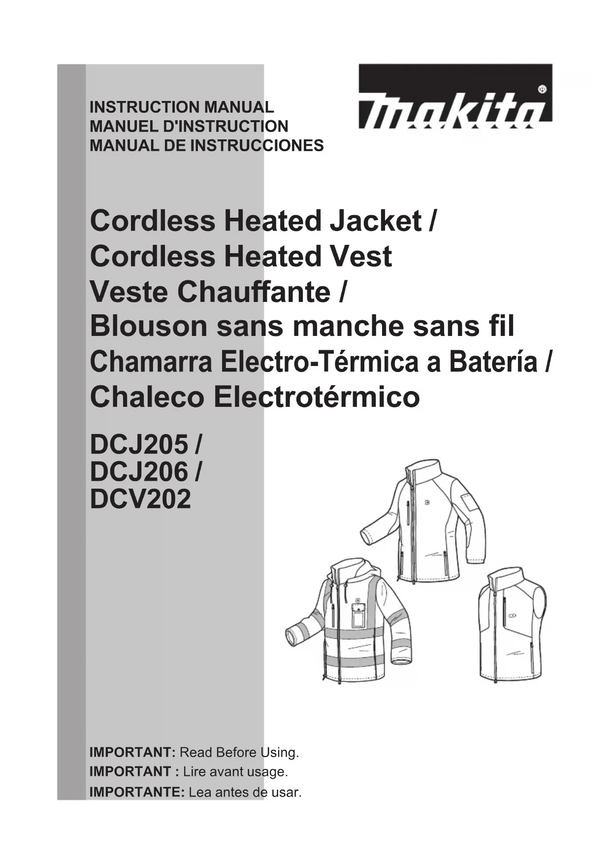 Please refer to the annexed warranty sheet for the most current warranty terms applicable to this product. If annexed warranty sheet is not available, refer to the warranty details set forth at below website for your respective country. United States of America: www.makitatools.com Canada: www.makita.ca Other countries: www.makita.com14 FRANÇAIS FRANÇAIS (Mode d’emploi original) SPÉCIFICATIONS Modèle : DCJ205 DCJ206 DCV202 Matériau Revêtement extérieur : 100 % polyester Côtés : 100 % polyester Doublure : 100 % polyester Revêtement exté- rieur et doublure : 100 % polyester Revêtement extérieur : 100 % polyester Côtés : 85 % polyester 15 % élasthanne Doublure : 100 % polyester Niveaux de réglage de la température 3 Poids net * 1,1 kg (2,4 lb) 0,4 kg (0,9 lb) *. La taille du blouson ou du blouson sans manches est « L ». Sans porte-batterie ni batterie. Spécications pour porte-batterie et batterie - Batterie applicable BL1055B BL1415N / BL1430B / BL1440 / BL1460B BL1815N / BL1820B / BL1830B / BL1840B / BL1850B / BL1860B Porte-batterie applicable Aucun porte-batterie requis Porte-batterie pour batterie LXT Tension nominale C.C. 10,8 V C.C. 14,4 V C.C. 18 V Port d’alimentation USB Tension de sortie C.C. 5 V Courant de sortie 1,5 A 2,4 A Type Type C Type A