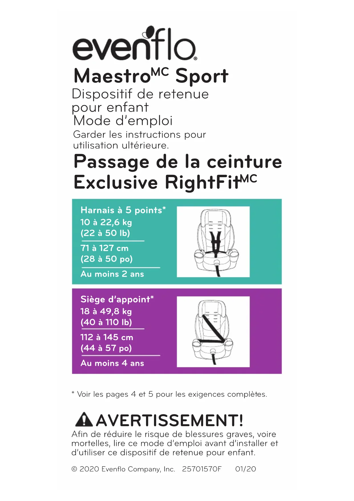 Sport Mode d’emploi Garder les instructions pour utilisation ultérieure.Afin de réduire le risque de blessures graves, voire mortelles, lire ce mode d’emploi avant d’installer et d’utiliser ce dispositif de retenue pour enfant. AVERTISSEMENT! © 2020 Evenflo Company, Inc. 25701570F 01/20Harnais à 5 points*10 à 22,6 kg(22 à 50 lb)71 à 127 cm(28 à 50 po)Au moins 2 ansSiège d’appoint*18 à 49,8 kg(40 à 110 lb)112 à 145 cm(44 à 57 po)Au moins 4 ans