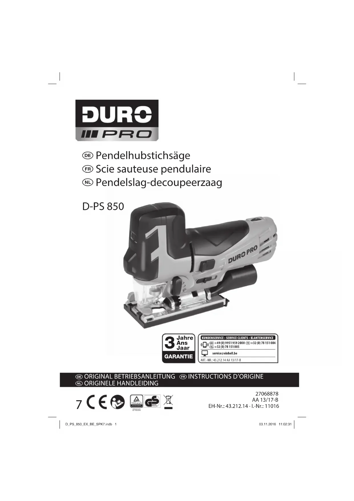 Nous fournissons une garantie de 3 ans pour l’appareil décrit dans le mode d’emploi, en cas de vice de notre produit. Le délai de 3 ans commence avec la transmission du risque ou la prise en charge de l’appareil par le client. La condition de base pour le faire valoir de la garantie est un entretien en bonne et due forme, conformément au mode d’emploi, tout comme une utilisation de notre appareil selon l’application prévue. Vous conservez bien entendu les droits de garantie légaux pendant ces 3 ans. La garantie est valable pour l’ensemble de la République Fédérale d’Allemagne ou des pays respectifs du partenaire commercial principal en complément des prescriptions légales locales. Veuillez noter l’interlocuteur du service après- vente compétent pour votre région ou l’adresse mentionnée ci-dessous. ISC (International Service Center) Eschenstrasse 6 94405 Landau/Isar, Duitsland Tel. Deutschsprachig: +49 (0)9951 959 2000 Tel. Nederlandstalig: +32 (0)78 151 085 Tel. Francophone: +32 (0) 78 151 084 MAIL: service@einhell.be e D_PS_850_EX_BE_SPK7.indb 34D_PS_850_EX_BE_SPK7.indb 34 03.11.2016 11:02:4203.11.2016 11:02:42N