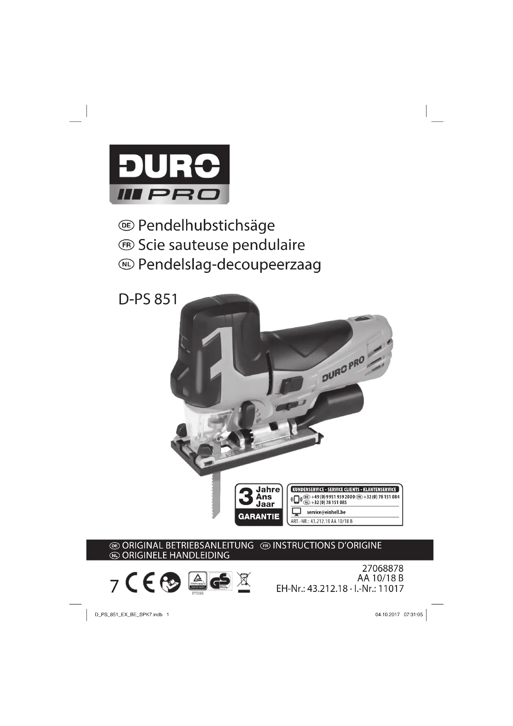 Nous fournissons une garantie de 3 ans pour l’appareil décrit dans le mode d’emploi, en cas de vice de notre produit. Le délai de 3 ans commence avec la transmission du risque ou la prise en charge de l’appareil par le client. La condition de base pour le faire valoir de la garantie est un entretien en bonne et due forme, conformément au mode d’emploi, tout comme une utilisation de notre appareil selon l’application prévue. Vous conservez bien entendu les droits de garantie légaux pendant ces 3 ans. La garantie est valable pour l’ensemble de la République Fédérale d’Allemagne ou des pays respectifs du partenaire commercial principal en complément des prescriptions légales locales. Veuillez noter l’interlocuteur du service après-vente compétent pour votre région ou l’adresse mentionnée ci-dessous. ISC (International Service Center) Eschenstrasse 6 94405 Landau/Isar, Duitsland Tel. Deutschsprachig: +49 (0)9951 959 2000 Tel. Nederlandstalig: +32 (0)78 151 085 Tel. Francophone: +32 (0) 78 151 084 MAIL: service@einhell.be e D_PS_851_EX_BE_SPK7.indb 44D_PS_851_EX_BE_SPK7.indb 44 04.10.2017 07:38:2104.10.2017 07:38:21N