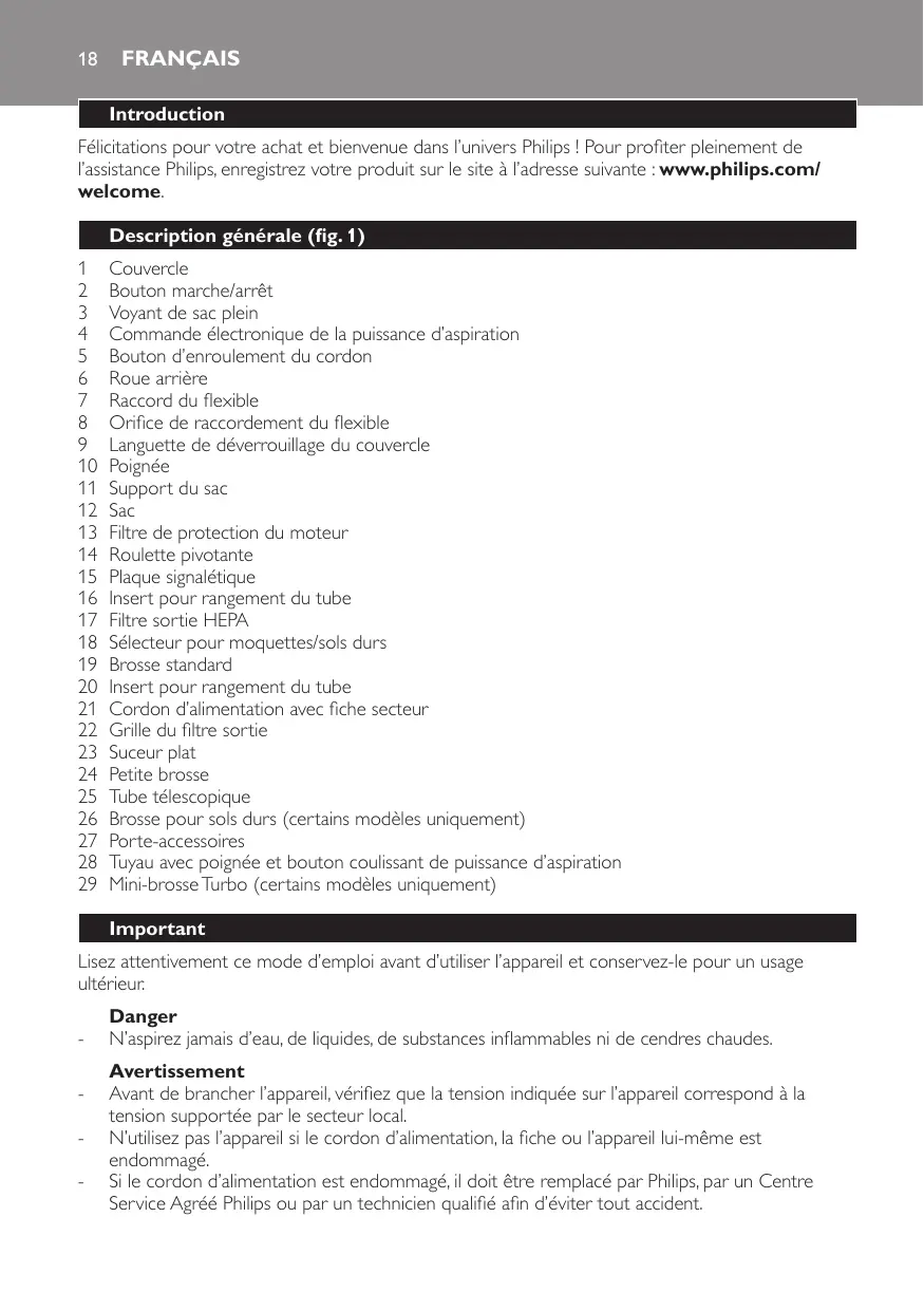 Danger -- N’aspirez jamais d’eau, de liquides, de substances inflammables ni de cendres chaudes. Avertissement -- Avant de brancher l’appareil, vérifiez que la tension indiquée sur l’appareil correspond à la tension supportée par le secteur local. -- N’utilisez pas l’appareil si le cordon d’alimentation, la fiche ou l’appareil lui-même est endommagé. -- Si le cordon d’alimentation est endommagé, il doit être remplacé par Philips, par un Centre Service Agréé Philips ou par un technicien qualifié afin d’éviter tout accident.