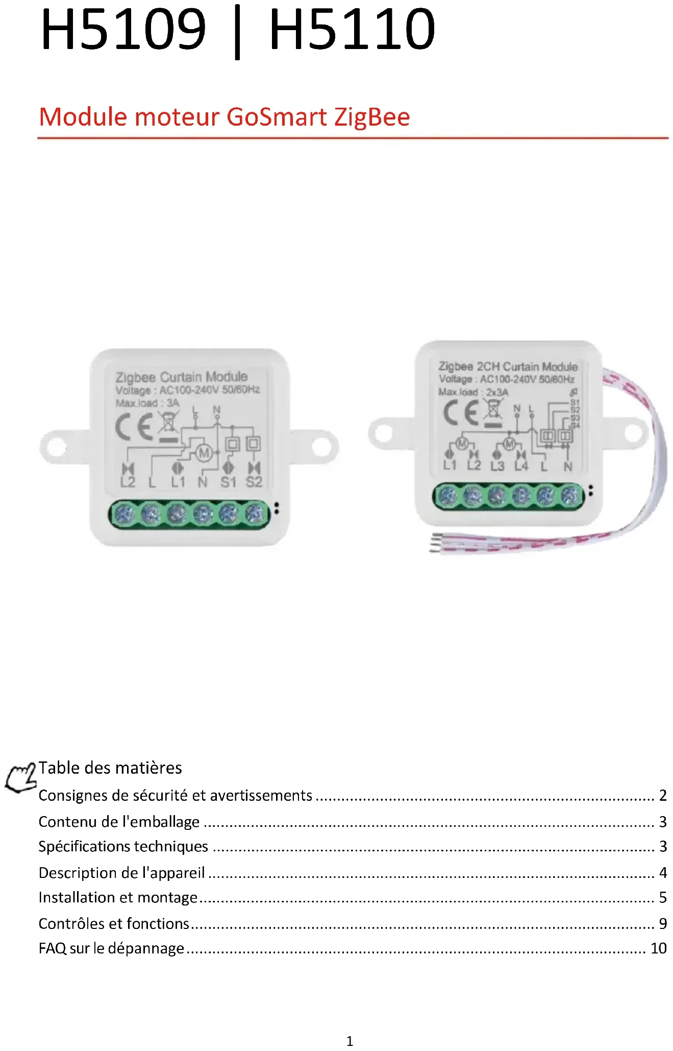 Avis Il est fortement recommandé que le module Smart Switch soit installé par une personne ayant des connaissances en électricité. Une installation mal réalisée peut présenter un risque de choc électrique. Suivez attentivement les instructions suivantes et respectez les charges maximales de l'équipement indiquées ci-dessous pour garantir un fonctionnement sûr et correct. Charge maximale Module à 1 canal avec conducteurs LN - 3 A Module à 2 canaux avec fils LN - 2× 3 A Modules ZigBee