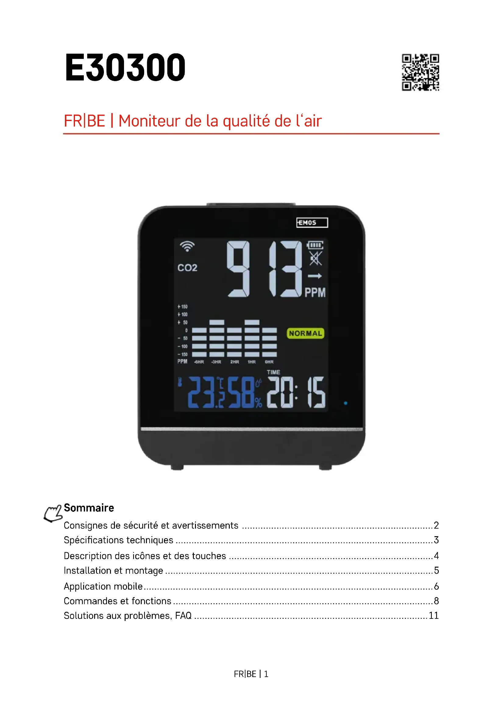 26FR|BE | 5 Installation et montage Si l‘air que vous respirez a une forte concentration en CO2, vous risquez une intoxication au dioxyde de car- bone. Les symptômes d‘une telle intoxication sont par exemple des maux de tête, des pulsations cardiaques irrégulières, des nausées, une perte de conscience, voire même le décès. Ce moniteur sera idéal dans les habitations, les bureaux, les salles de réunion, les magasins, etc. Son emplacement idéal est à 1,5 m du sol, à peu près à la hauteur des interrupteurs. Une fois que vous l‘aurez sorti de sa boîte, laisser reposer l‘appareil à un endroit bien ventilé et ne le mettre en service qu‘une heure plus tard. Ne pas installer cet appareil à proximité d‘un lit, la respiration pourrait en eet fausser les valeurs relevées. Ne pas installer cet appareil dans un coin ou derrière un meuble, la poussière pourrait encrasser le capteur. Ne pas installer cet appareil juste à côté d‘une porte ou d‘une fenêtre, les courants d‘air pourrait fausser les valeurs relevées en les réduisant.FR|BE | 6 Application mobile Le moniteur de la qualité de l‘air peut être commandé à l‘aide d‘une application mobile pour iOS ou Android. Télécharger l‘application „EMOS GoSmart“ pour votre appareil. Cliquer sur le bouton „Se connecter“ si vous utilisez déjà l‘application. Dans le cas contraire, cliquer sur le bouton „S‘inscrire“ et terminer votre inscription. Appariement avec l‘application