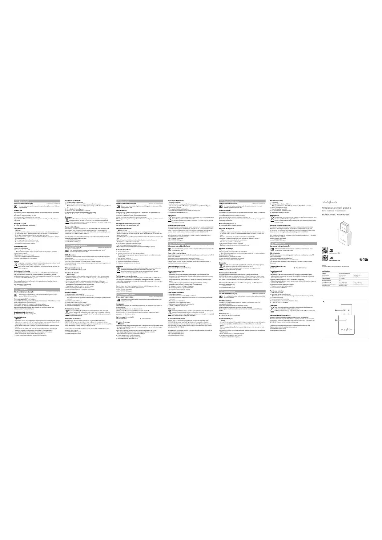 - Ne pas utiliser le produit si une pièce est endommagée ou défectueuse. Remplacez immédiatement un produit endommagé ou défectueux.• Ne pas laisser tomber le produit et éviter de le cogner.• Ne pas exposer le produit à l'eau ou à l'humidité.• Déconnectez le produit avant de procéder au nettoyage.Installer le produit1. Mettez votre ordinateur en marche.2. Insérez le produit dans un port USB de votre ordinateur. 4Une fenêtre contextuelle apparaît sur votre ordinateur pour indiquer que le produit est connecté.3. Ouvrez l’explorateur Windows.4. Double-cliquez sur le lecteur du produit.5. Suivez les instructions de l’assistant d’installation.6. Connectez votre ordinateur à un réseau Wi-Fi.Traitement des déchetsLe produit doit être jeté séparément des ordures ménagères dans un point de collecte approprié. Ne jetez pas le produit avec les ordures ménagères ordinaires.Pour plus d’informations, contactez le distributeur ou l’autorité locale responsable de la gestion des déchets.Déclaration de conformitéNous, Nedis B.V., déclarons en tant que fabricant que le produit WSNWM310BK / WSNWM610BK de notre marque Nedis®, produit en Chine, a été testé conformément à toutes les normes et réglementations CE en vigueur et que tous les tests ont été réussis. Cela inclut, sans toutefois s'y limiter, la directive RED 2014/53/UE.La Déclaration de conformité complète (et la che de sécurité le cas échéant) peut être trouvée et téléchargée via :nedis.fr/WSNWM310BK#supportnedis.fr/WSNWM610BK#support Guia de iniciação rápida Dongle de rede sem os WSNWM310BK / WSNWM610BKPara mais informações, consulte a versão alargada do manual on-line: ned.is/wsnwm310bk ned.is/wsnwm610bkUtilização previstaEste produto é um dongle de rede sem os destinado a receber uma ligação Wi-Fi estável no seu computador.Este produto destina-se apenas a utilização interior.Utilize o produto apenas conforme descrito neste documento.Qualquer alteração do produto pode ter consequências em termos de segurança, garantia e funcionamento adequado.Peças principais (imagem A)1 Conetor USB 2 LED indicador de estadoInstruções de segurança -AVISO